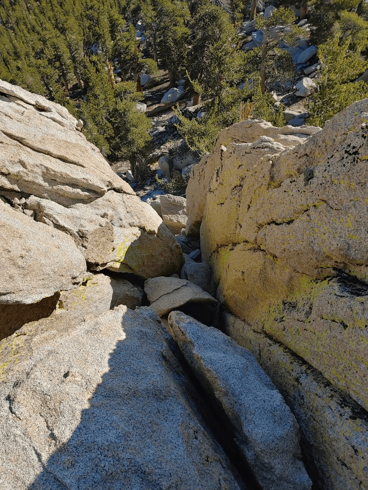 Marion Mountain has a west and east summit of nearly equal elevation. The east summit is where Marion Mountain is located on topographic maps, but the west summit is a bit higher and is recognized by the Sierra Club as the true summit. The west summit is comprised of large boulders with no easy way to the top. I circled the summit area looking for a way to climb up. I eventually found a register tucked underneath some rocks on the northeast side of the summit block. Not far from the register I located the class 3 crack I had read about (the picture makes it look harder than it is).
