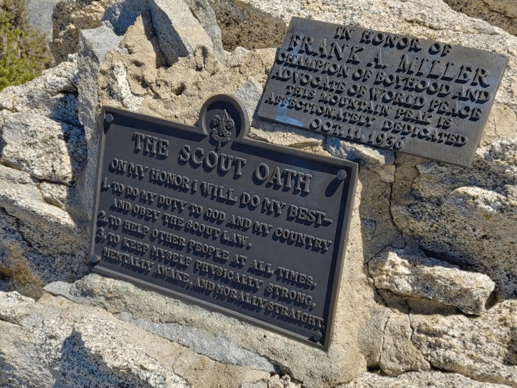 I left the trail where it makes a hairpin turn just west of Miller Peak. It was a very short climb from there. I reached the summit of Miller at 11:15am at 6.52 miles. There is a plaque on the summit honoring Frank Miller, who was an old boy scout leader.