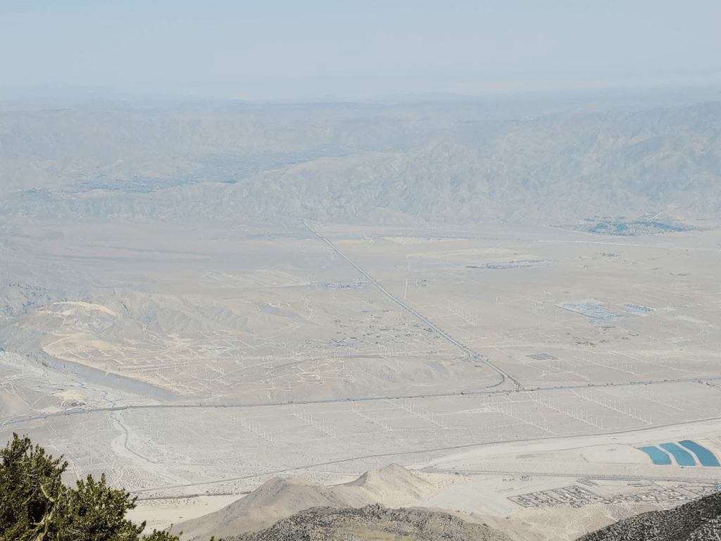 I could plainly see the San Gorgonio Pass Wind Farm and State Route 62 leading up to Yucca Valley and Twentynine Palms.