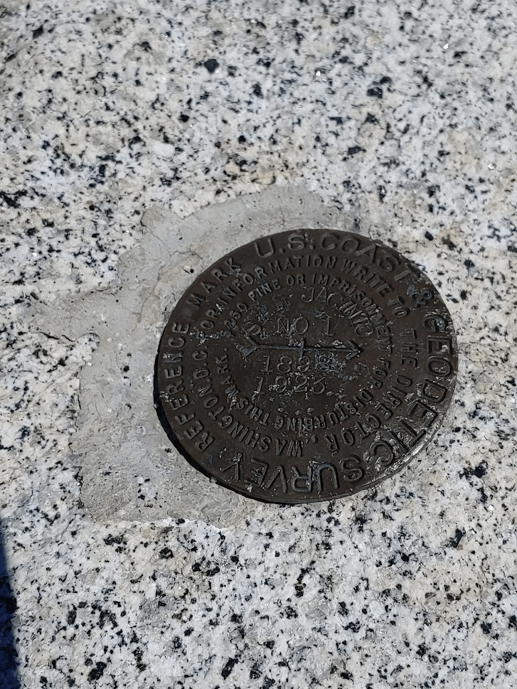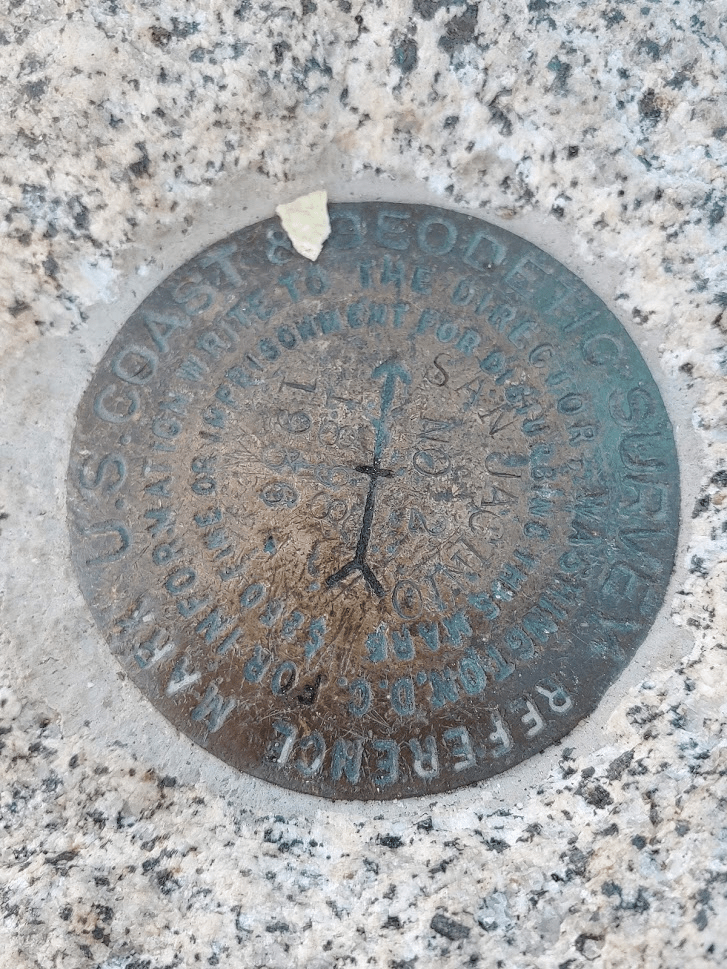 I signed the register before continuing. I noted that the hiker who had placed the register in 2015 signed his name as the “Old man with the twisted blue hiking stick.” I went north off the summit towards San Jacinto. Before reaching the trail, I found the San Jacinto Azimuth Marker. This marker was located on a small prominence just south of the saddle between Jean and San Jacinto.