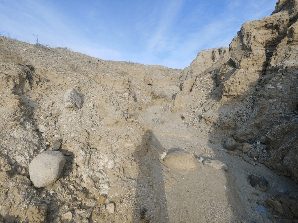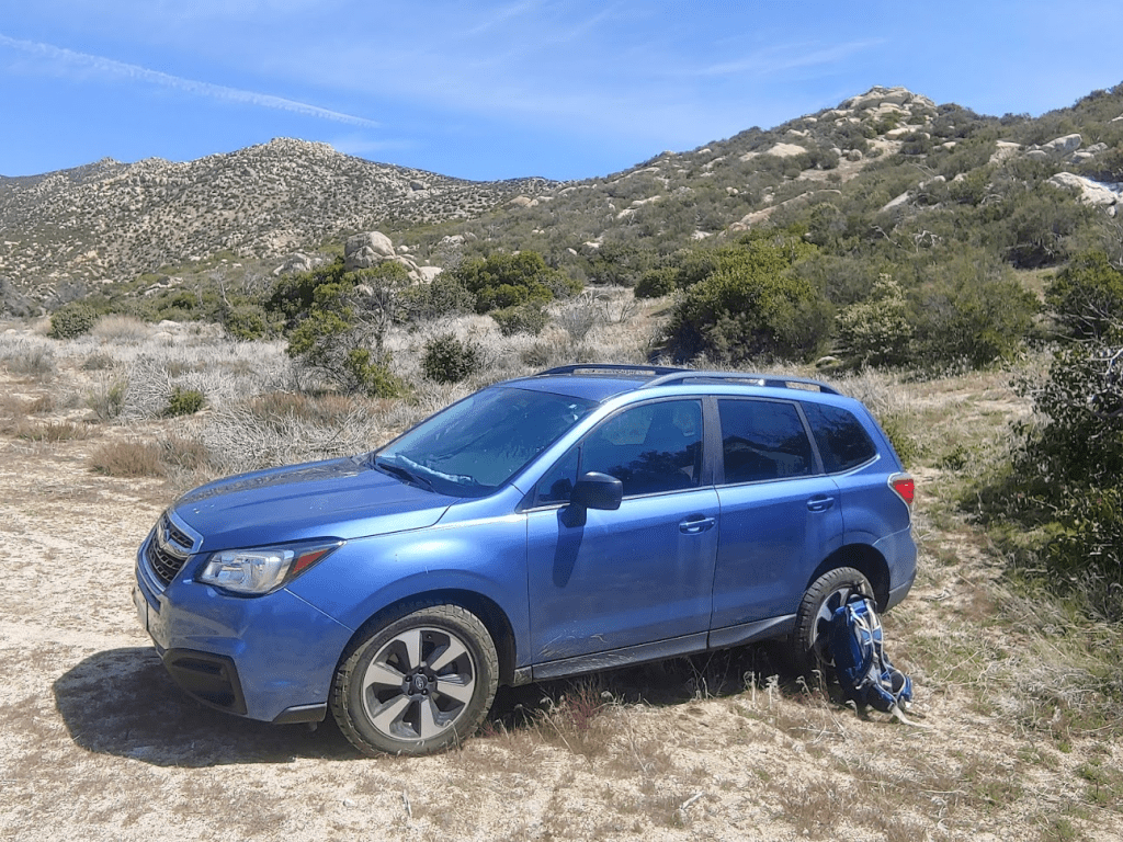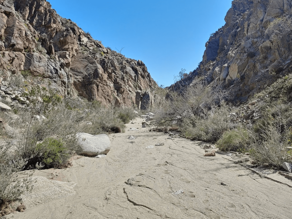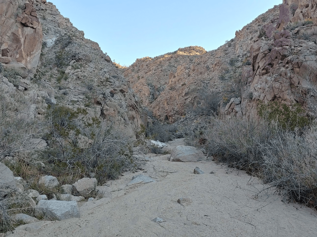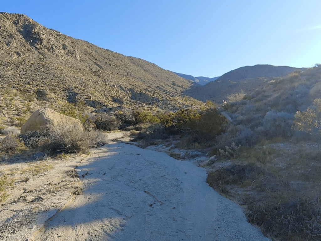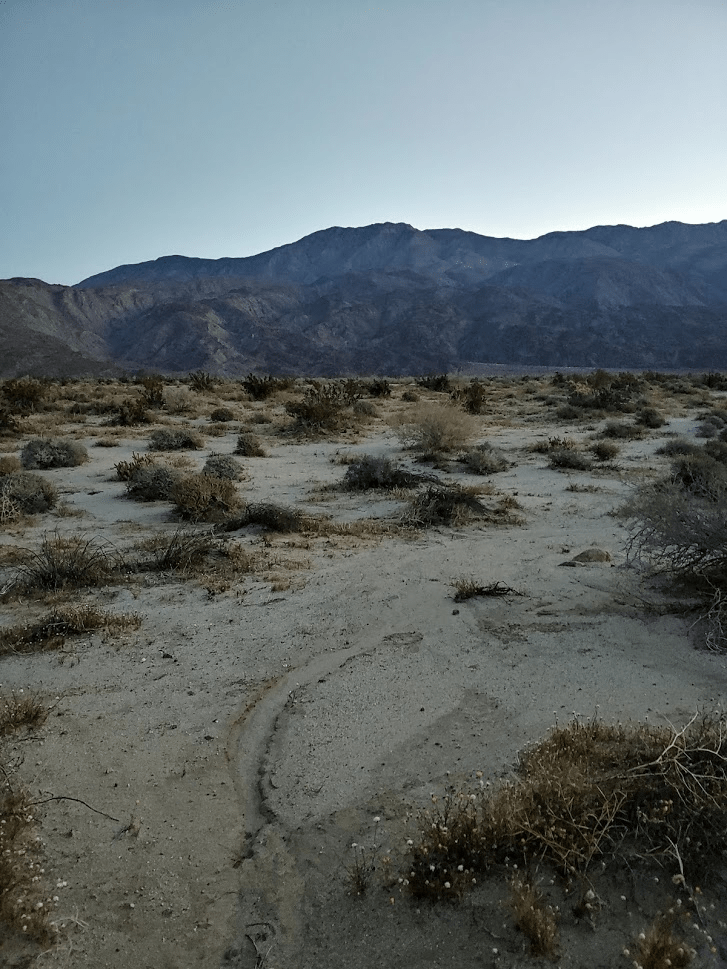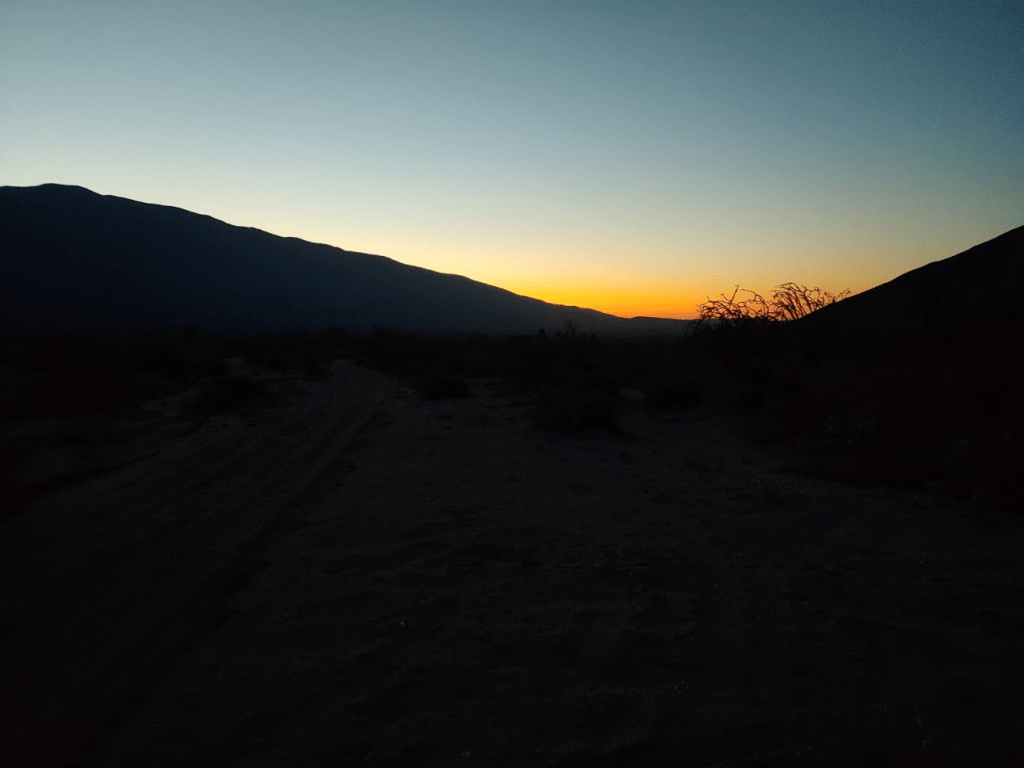 Normally I would have driven into Borrego Springs to eat at one of its charming little restaurants for dinner, but in the spirit of social distancing, I had brought all of my own food with me. I also had left San Diego with a full tank of gas, so I didn’t need to make any stops. I made the sandy drive back out to Highway S22, where I went west for a few miles where I turned right (north) onto unpaved Rockhouse Canyon Road. It was about a 7 mile drive to where I intended to start the next day’s hike. The first few miles are very smooth and passable for any car. Then, you must drive over Clark Dry Lake for a short stretch. It was a little muddy from the recent rains, so needless to say my car got filthy. The final few miles to where I parked were a little bumpier but not too bad. I found a good spot to pull off the road and spend the night.