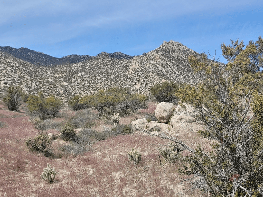 After some stormy weather had changed my hiking plans the day before, things had warmed up nicely, so I was able to head out to the desert for a 2 day adventure in Anza Borrego Desert State Park. I got a later start than I usually do, leaving San Diego around 9:30am Saturday morning. I was thinking some of the higher elevations would have snow from the cold storm that passed through the area Thursday night, so I was planning on just doing a few shorter hikes down in the valley. However, as I drove through Ranchita, I didn’t see any snow in the San Ysidro Mountains, so I decided to hit a few peaks there that I hadn’t done yet from the San Diego 100 peaks list. I was at 81/100 peaks, so there weren’t too many left for me to climb. My plan for the day would be 2 more peaks on the list, the Thimble and Goat Benchmark, as well as another random nearby peak, Hob Benchmark. My starting point would be at the north end of the small community of Ranchita. Driving east on Montezuma Valley Road (Hwy S22), I turned left (north) onto a dirt road called Via Oak Grove Lane. The road starts off smooth but eventually gets pretty rutted. After a mile or so I turned left onto Landmark Road, right onto Lease Road, and then another right. After a short way, the road forks, with a sign indicating public land to the left and private property to the right. I went left for a short way and parked. High clearance recommended.