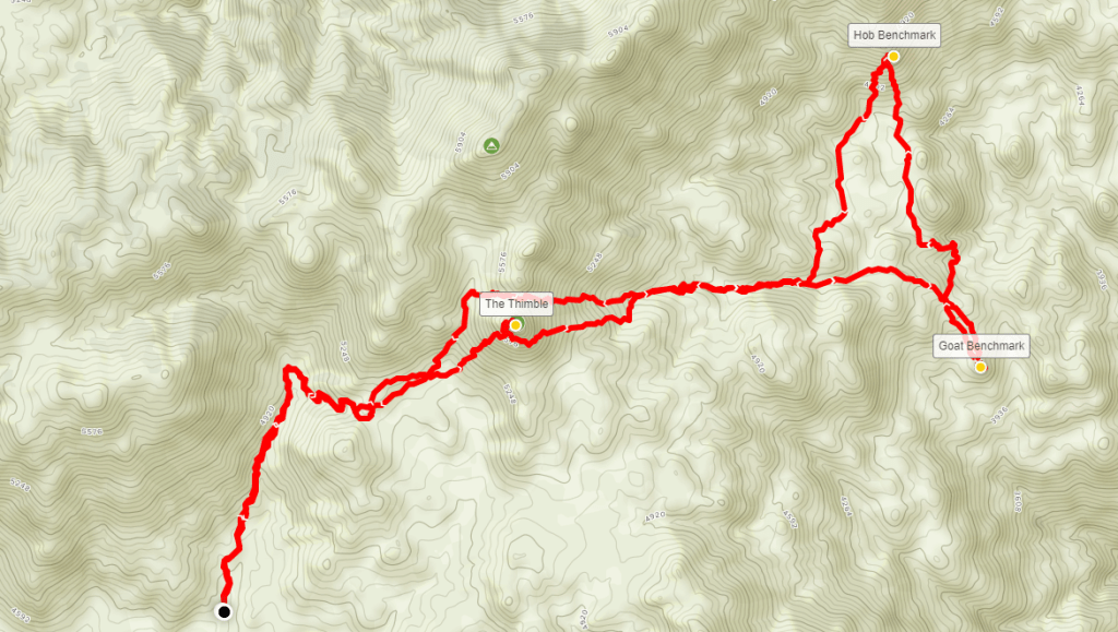 Next up was Goat Benchmark. I came off the summit the same way I ascended, once more hugging the large boulder to get around the brush. After descending about 100 feet, I started heading east around the south side of the Thimble. The large boulders made this tricky.