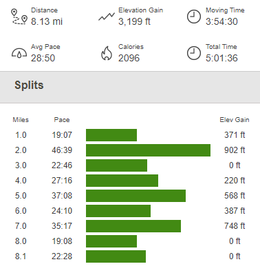 From there, it was an easy walk back to the car. This hike totaled 8.13 miles, 3199 feet elevation gain, and 5:01:36 total time.