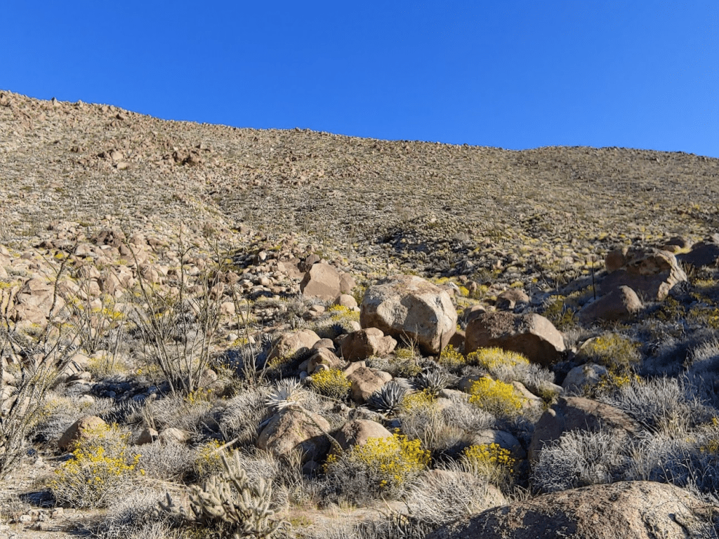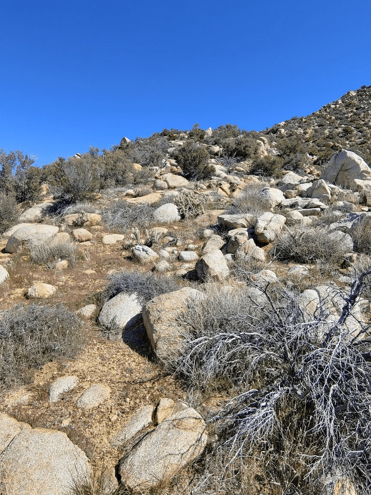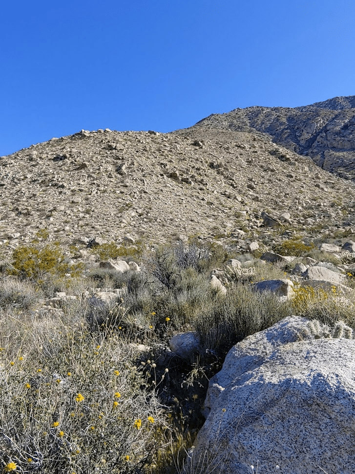 Hob Benchmark (4853 feet) is a few hundred feet higher than Goat. I started climbing up a rocky slope. Hob is part way up the slope pictured below. One could continue climbing to Middle Ysidro in this direction.