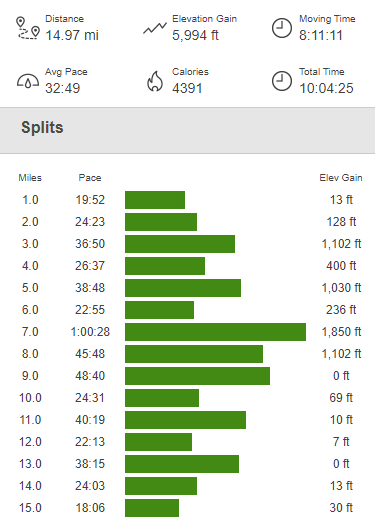 I clocked 14.97 miles, 5994 feet elevation gain, and 10:04:25 total time.