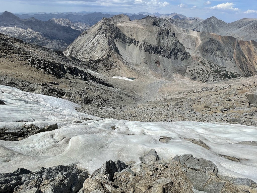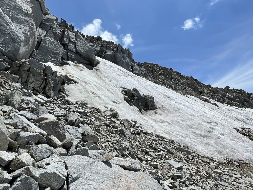 I began the descent after only a 15 minute break. Rather than climb down the chimney, I went west off the summit and found myself above the snowfield.