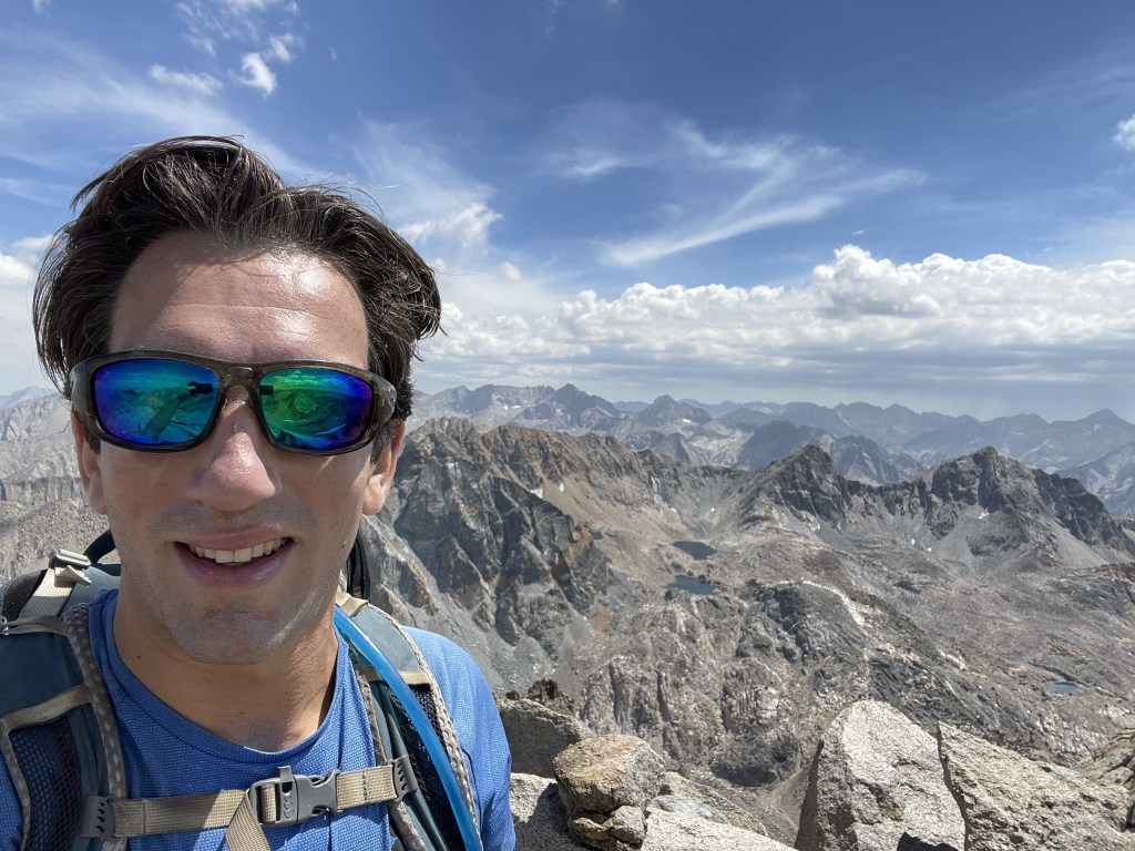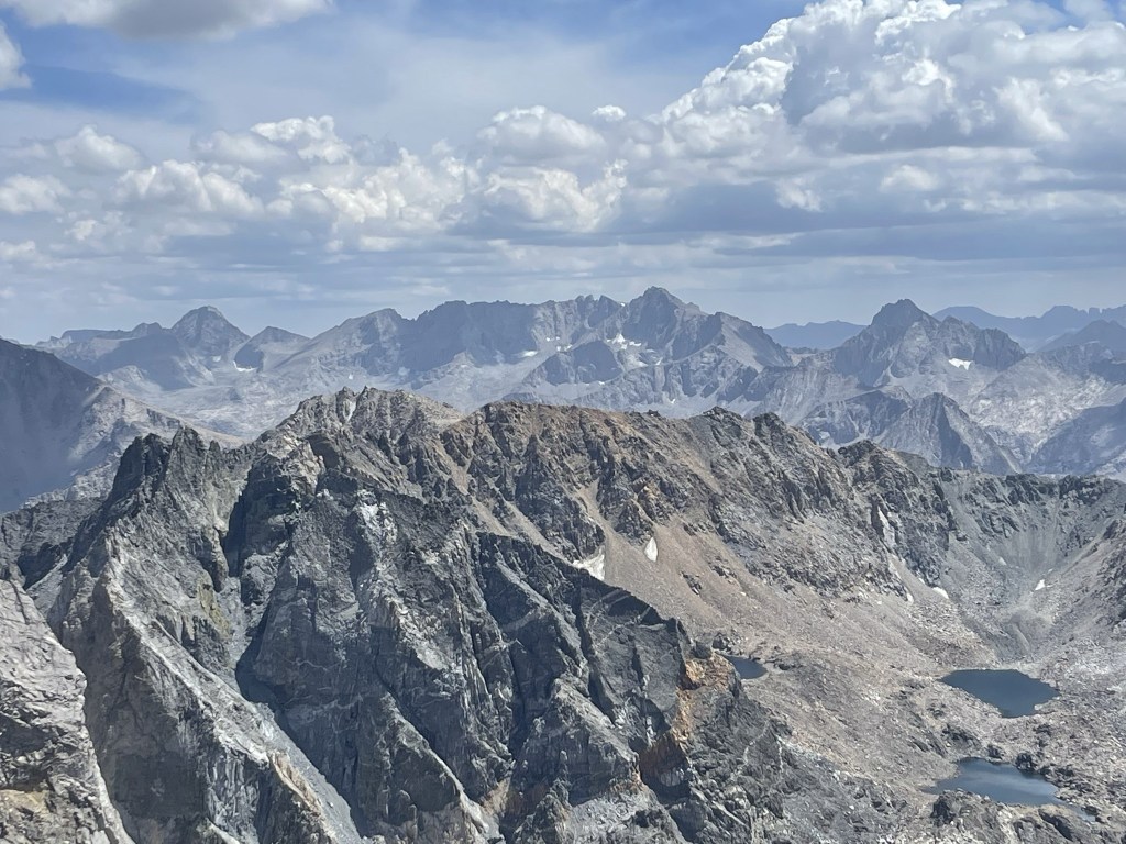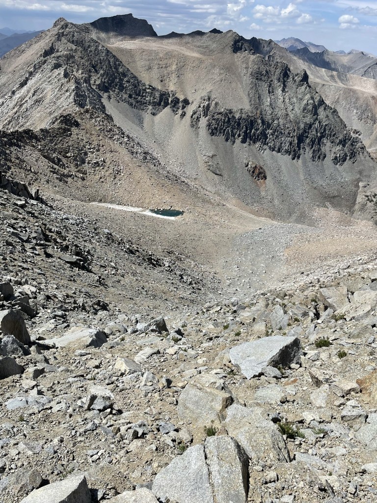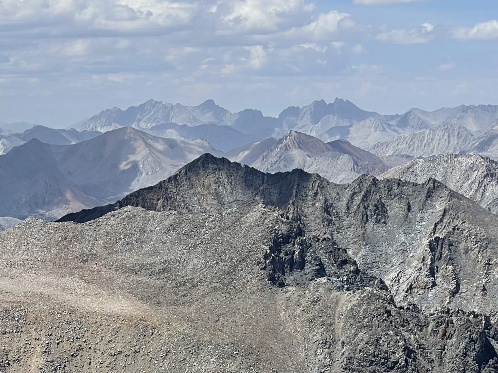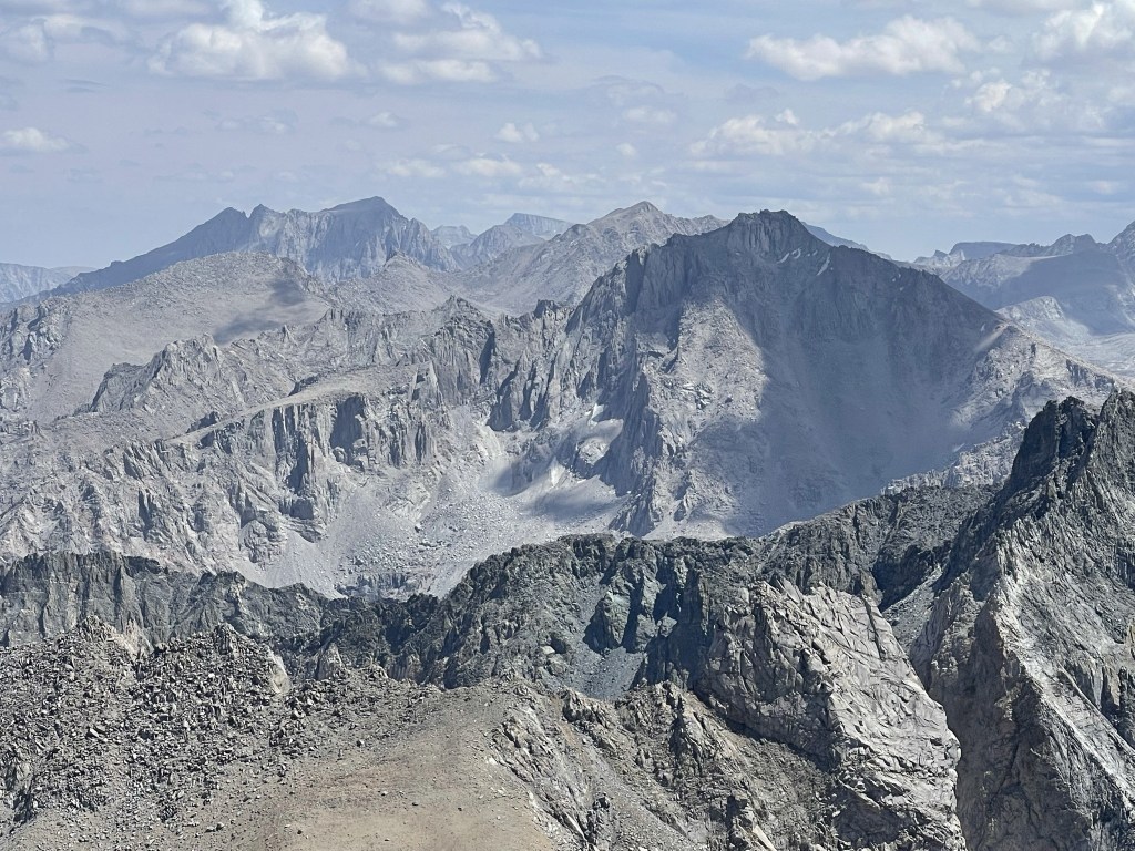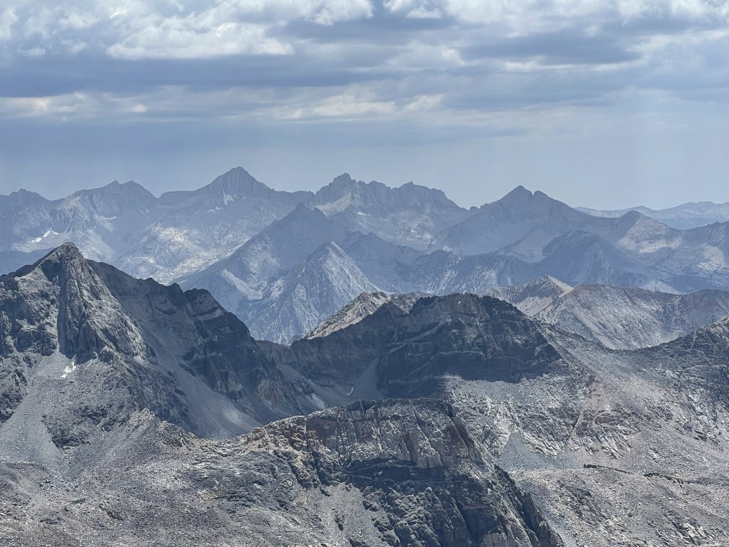 I was exhausted and out of breath. Unfortunately, I couldn’t take a very long break since I was worried about the daylight situation. It had taken me 6 hours to ascend, so if it took me a similar amount of time to get down it would be pretty dark (and I stupidly did not bring a headlamp). I knew I would descend much faster than I had come up, but I was still concerned. I signed the register (placed in 2005, previous ascent the day before), had a quick snack, and took a few pictures before heading down. Below is the southern view. From left to right: Mount Williamson, Mount Whitney, Mount Keith, and University Peak.