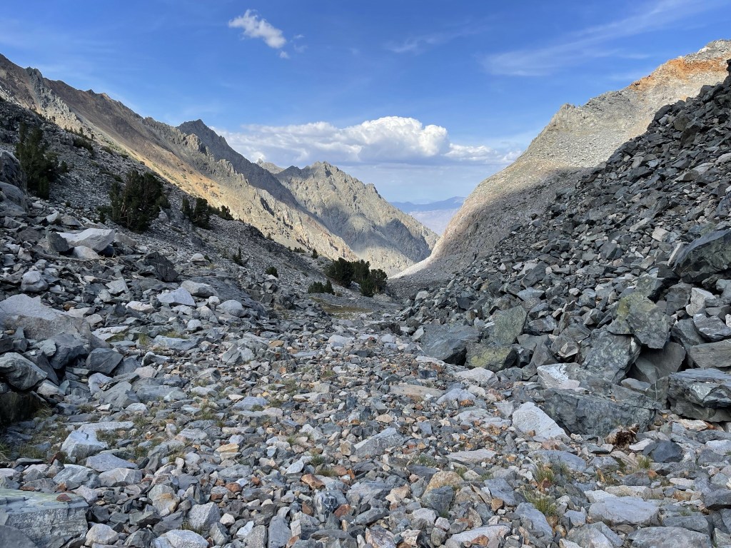 After 0.3 mile the grade lessened. I proceeded across the boulders and then reached the bottom of the final chute after another 0.3 mile.