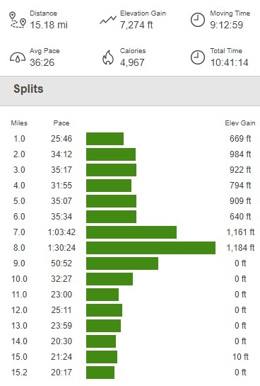 The final few miles were warm but thankfully the sun was setting behind the mountains to the west. I reached the trailhead at 7:14pm. This hike totaled 15.18 miles, 7274 feet elevation gain, and 10:41:14 total time.