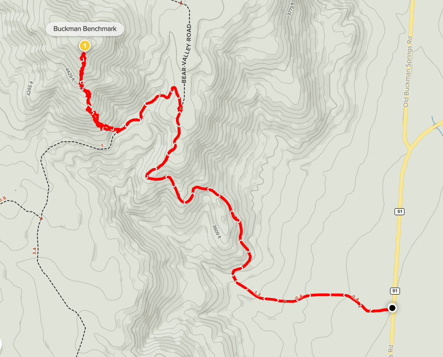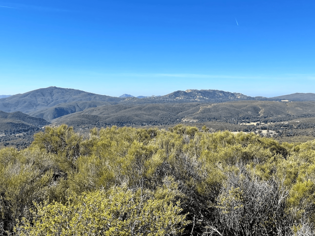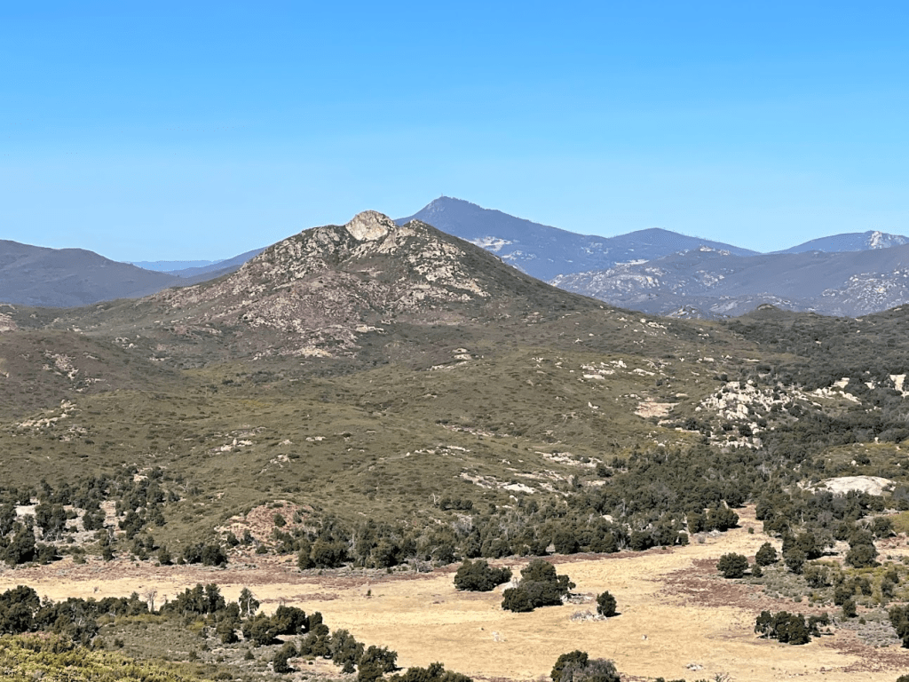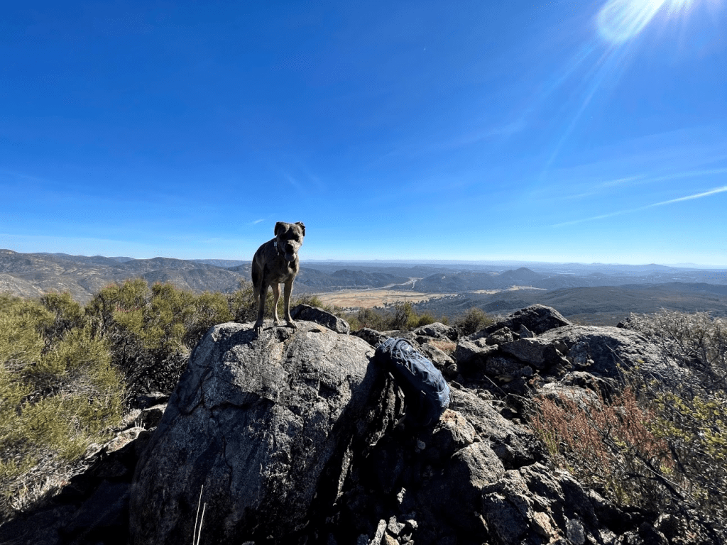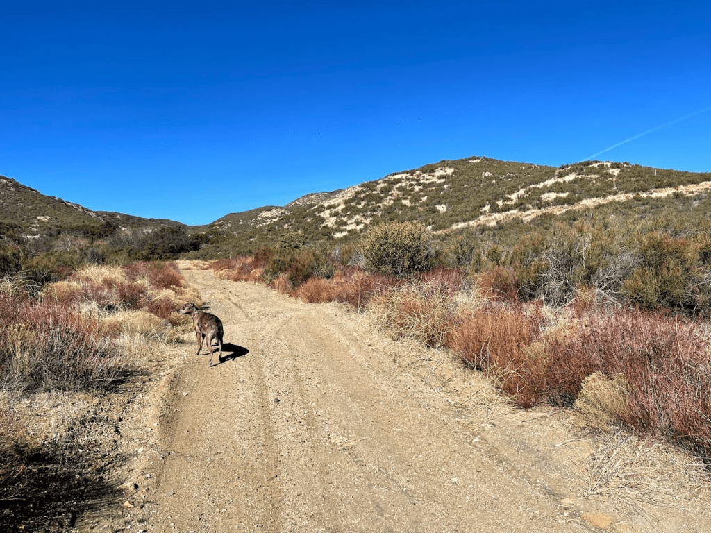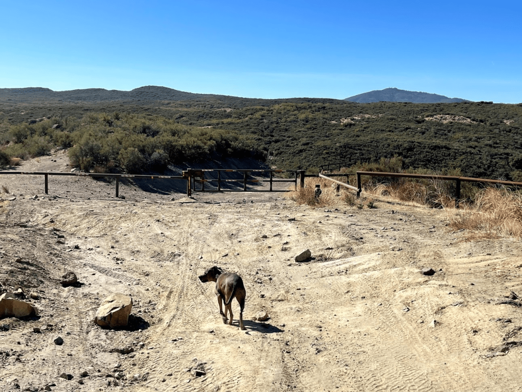 I was gradually trying to get back into hiking shape after my recent bout with Covid, so I decided to climb a few minor summits in the local San Diego mountains. My goal for the day would be Buckman Benchmark (4641 feet) and Long Valley Peak (4880 feet). Both peaks used to be on the Sierra Club San Diego County 100 Peaks List, but they were delisted for some unknown reason a few decades ago. I’ve already climbed all of the non-desert peaks on the current list which is why I turned my attention to these delisted peaks. To add to the fun, Stella would be joining me for the first time since we climbed Chariot Mountain (another delisted SDC Peak) back in November. We got a late start, not leaving San Diego until after 9am. We made the 1 hour drive and parked on Buckman Springs Road, which is a paved road just off of Interstate 8. I had intended to drive up Bear Valley Road to get closer to the peak, but the road was gated so I was forced to park there which added a couple miles to the hike. We started hiking at 10:22am from 3210 feet. I actually had to climb up the gate to hop over it, but Stella was able to crawl underneath it. Most trip reports I read indicated this gate is typically open so I have no idea why it was locked at this time. The peak was visible dead ahead as we began hiking up the forest road.
