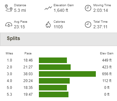 From there, it was an easy hike back down to the car, which we reached right at 1pm. This hike totaled 5.3 miles, 1640 feet elevation gain, and 2:37:11 total time.