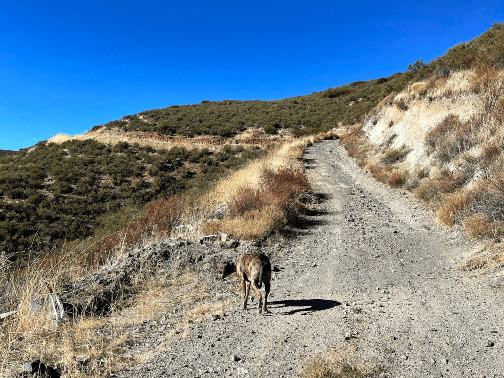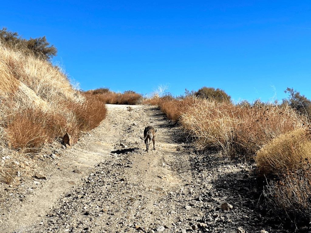 We reached the road once more at 3.1 miles. There were now quite a few jeeps and dirt bikes out and about. All of the roads in this area are popular OHV routes, which is perhaps why the peak was delisted. I put Stella on the leash to be safe until we reached the first locked gate.