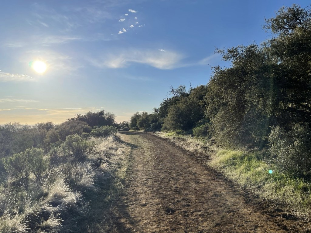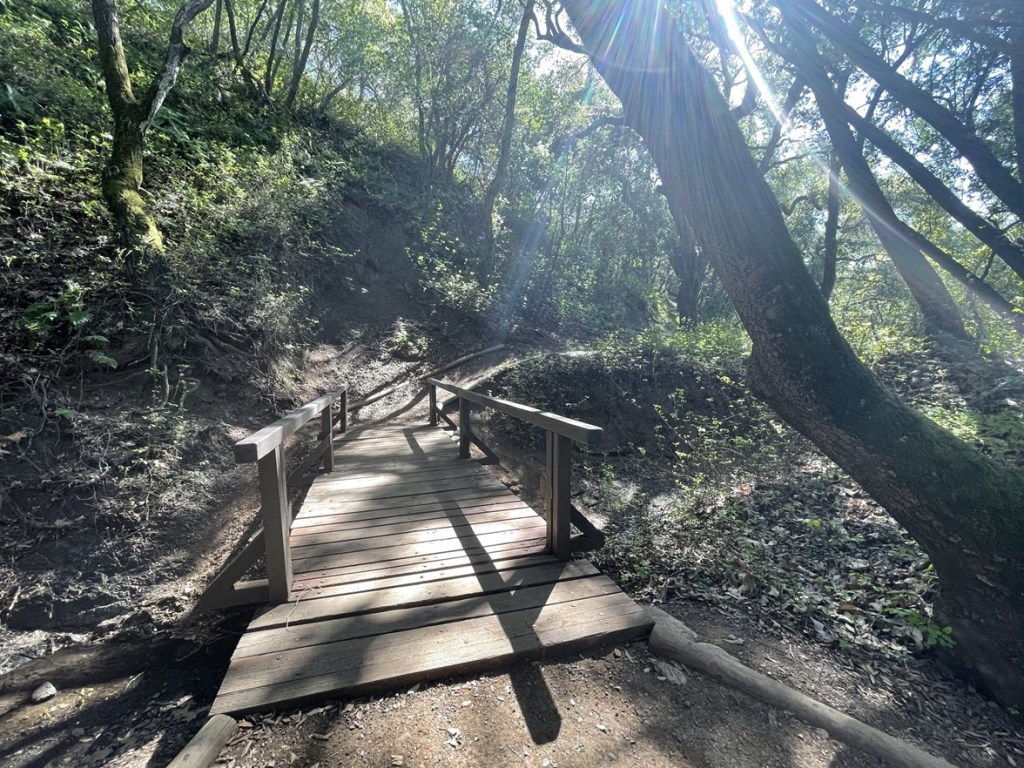 The trail started out in the shade under huge trees. I crossed a bridge over the East Fork Morro Creek. I noticed some poison oak growing on the side of the trail in this shaded section. Thankfully, the trail is very wide, so it’s easily avoided.