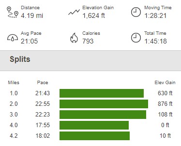 I reached the car again at 5:09pm. This hike totaled 4.19 miles, 1624 feet elevation gain, and 1:45:18 total time.