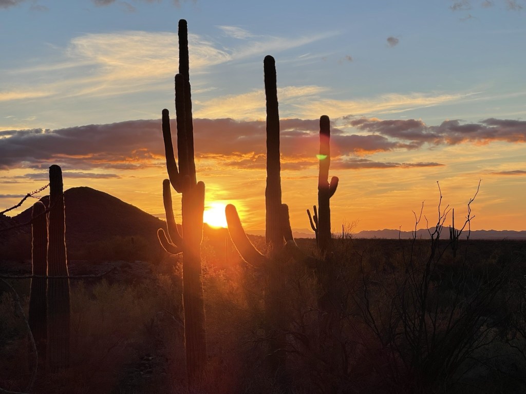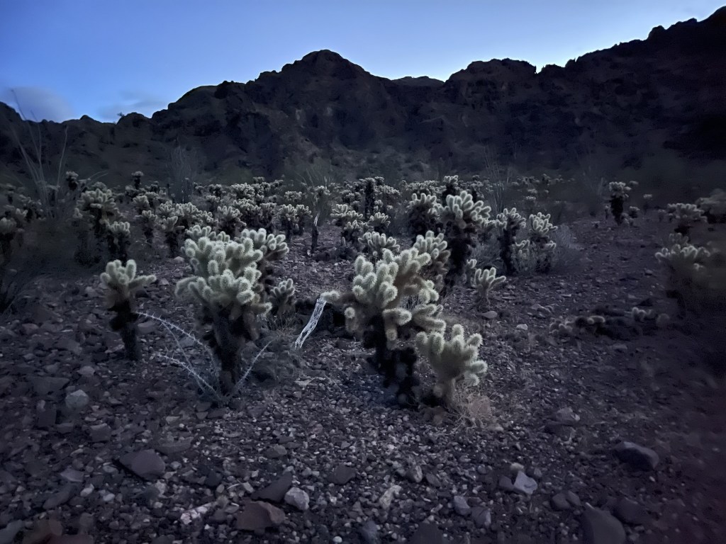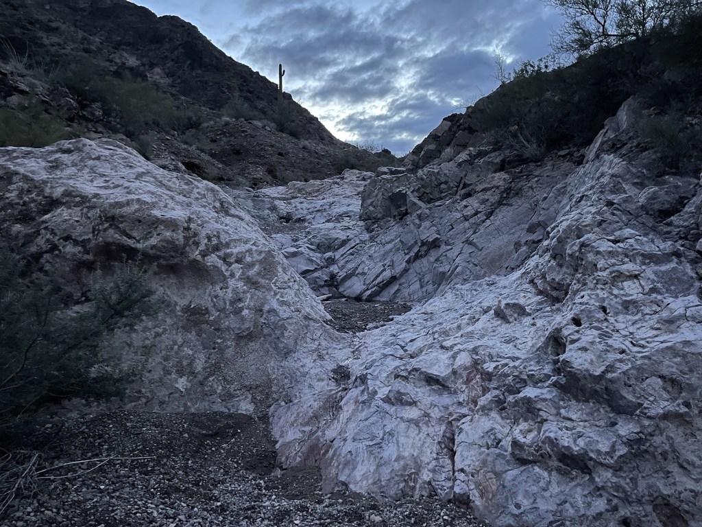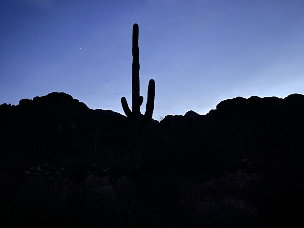 I hiked east into the mouth of a large wash by the light of my headlamp. I took a cool picture of a saguaro silhouetted against the soft morning light.
