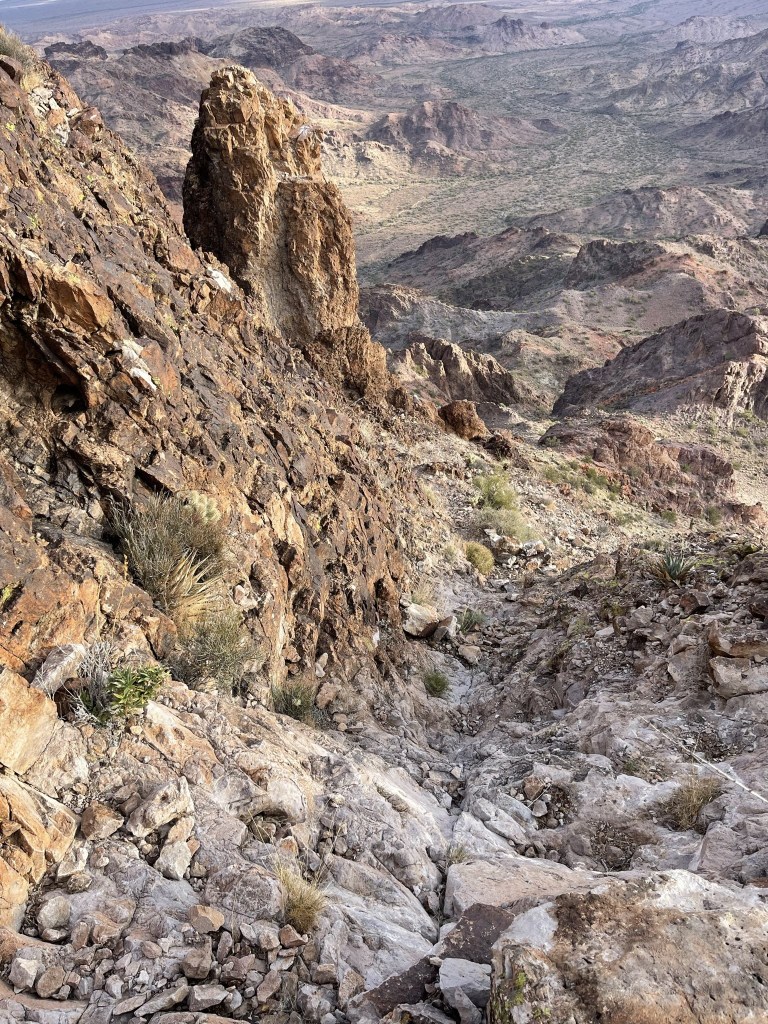 I managed to find the easier class 3 chute to descend near the rock pillar.