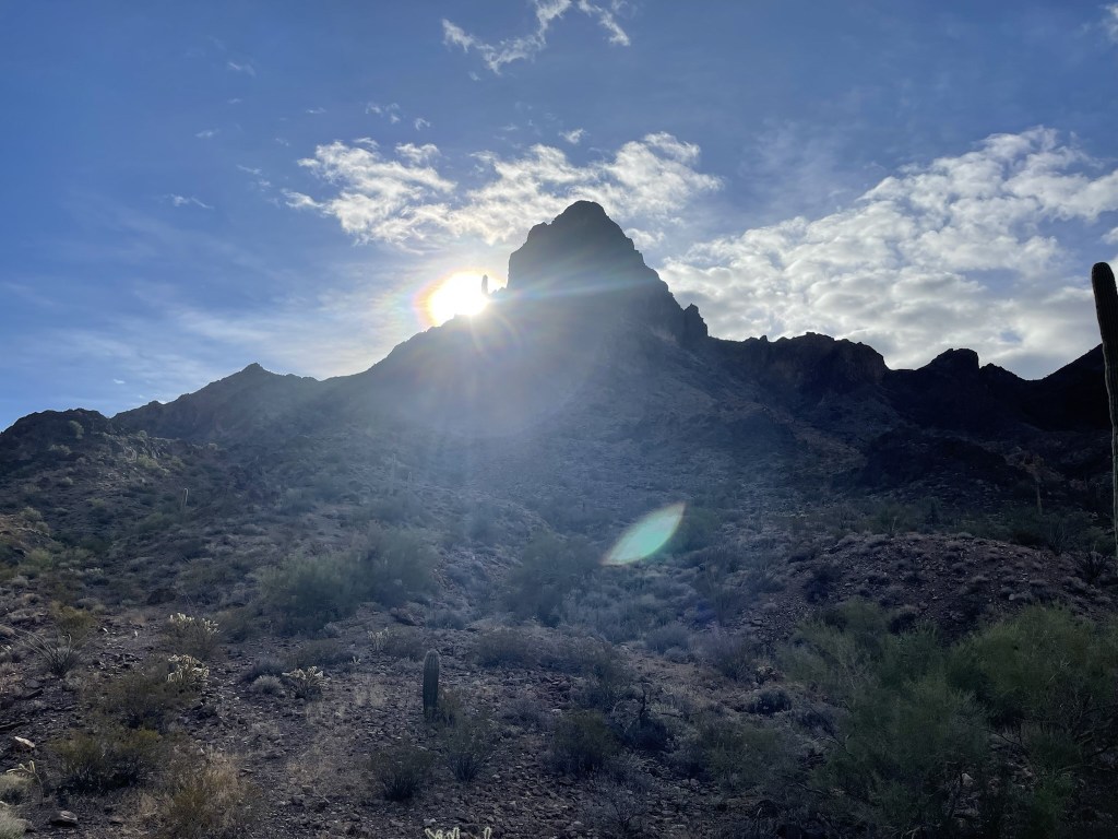From there I retraced my steps down the use trail and back into the wash. I got a cool picture of the sun peaking out from behind the mountain.