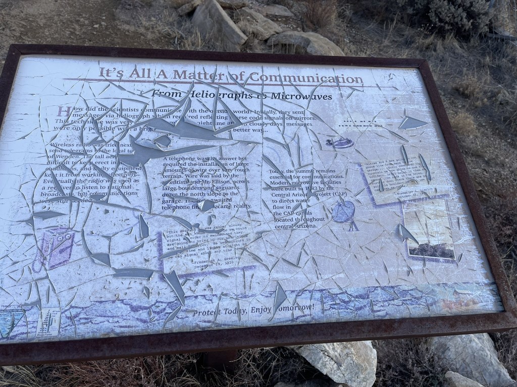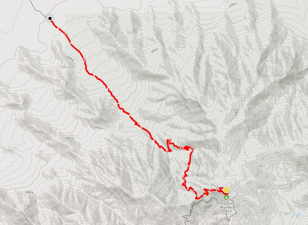 Next up was Harquahala Mountain. At 5681 feet, Harquahala Mountain is the highpoint of La Paz County and the highest peak in all of southwestern Arizona. There are 2 ways to reach its summit. The first is a long 4wd road from Eagle Eye Road to the south, and the second is a 5 mile trail from the north. Obviously I opted for the trail approach, so I made the long 2.5 hour drive from the Castle Dome Mountains to the trailhead on the north side. From US Highway 60, I drove 2 miles south on a good dirt road to reach the trailhead. This road is in excellent shape but there are 1 or 2 sections near the beginning that you’ll probably want high clearance for. I began this hike at 1pm from 2310 feet above sea level.