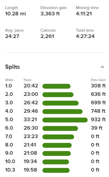 I reached the car at 5:28pm. This hike totaled 10.28 miles, 3363 feet elevation gain, and 4:27:24 total time.