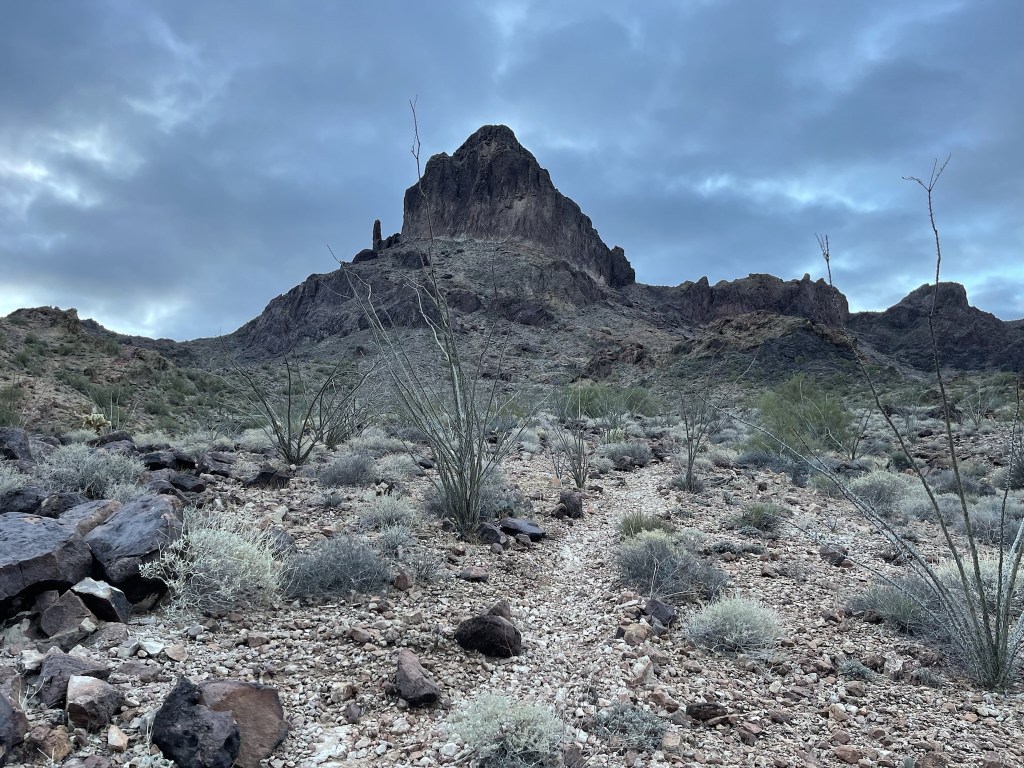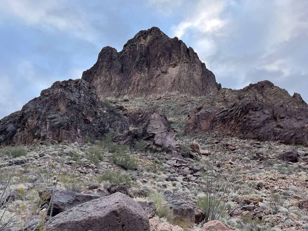 Castle Dome Peak is a 3788 foot peak in southwestern Arizona near Yuma. It is one of 2 visually striking peaks contained within Kofa National Wildlife Refuge. The other is Signal Peak which I had climbed in February 2019. Castle Dome Peak has over 2000 feet of prominence and is on the Sierra Club Desert Peaks Section (DPS) List. I left San Diego Saturday evening after Christmas dinner with some friends and drove about 3.5 hours to the trailhead described by the DPS guide. From US-95 I went northeast on Castle Dome Mine Road through Yuma Proving Ground about 5.5 miles and then turned north onto McPherson Pass Road which I drove on for about 7 miles and then parked. This differs from the DPS directions by avoiding the Castle Dome Mine which is private property. I started hiking Sunday morning at 6:52am from 1707 feet above sea level.