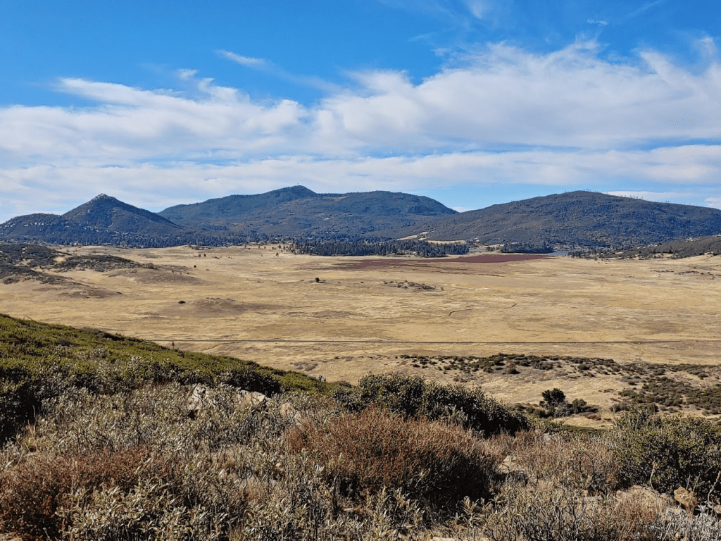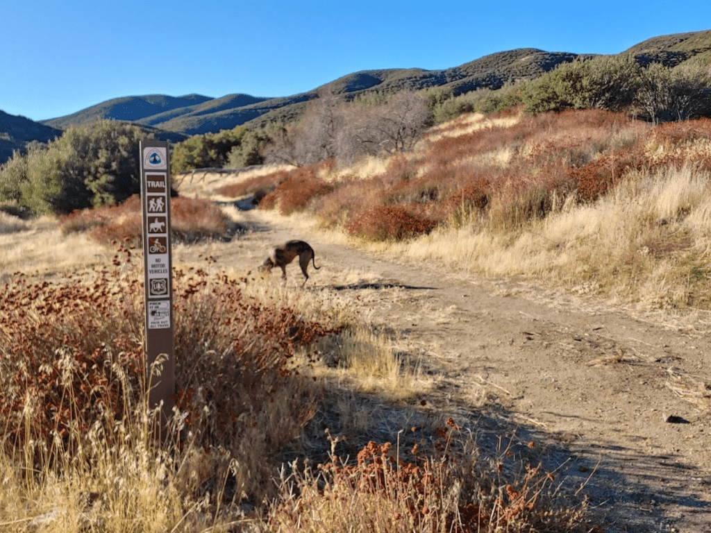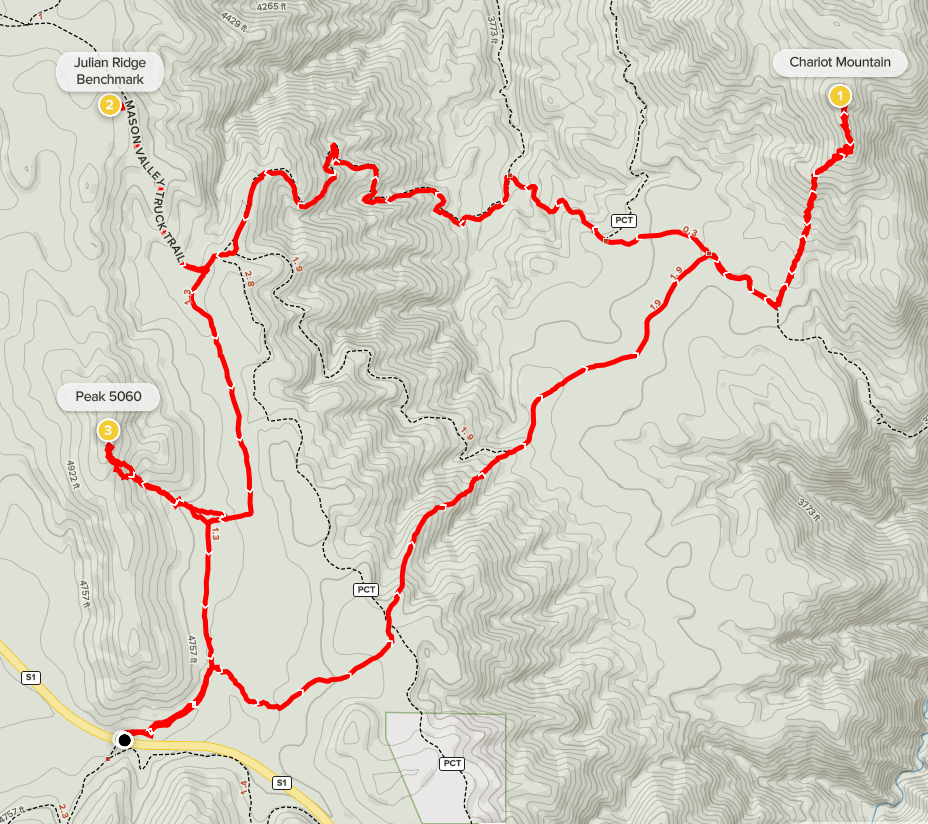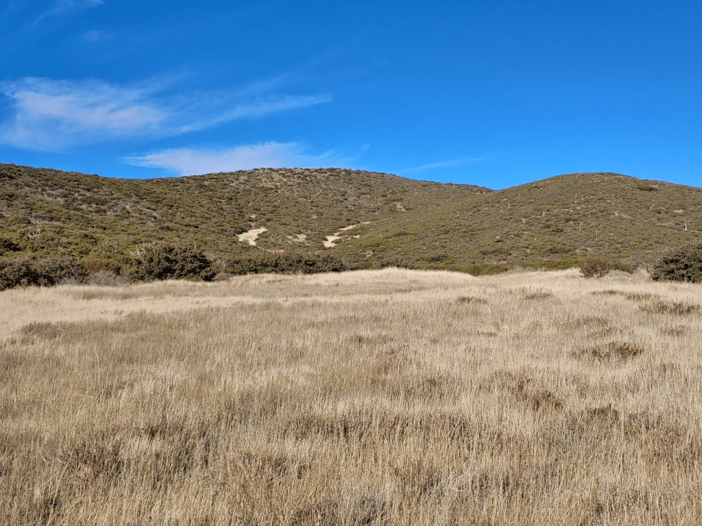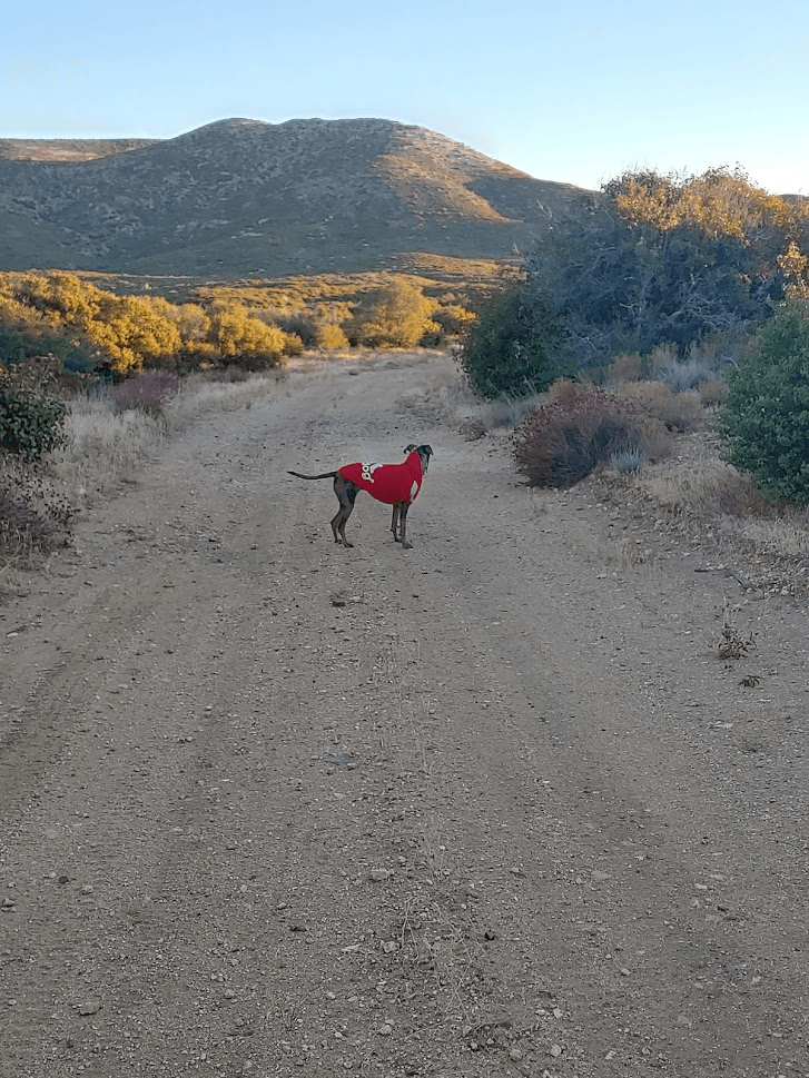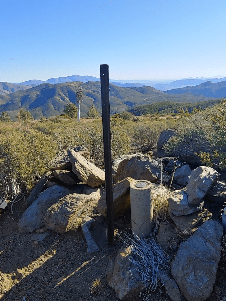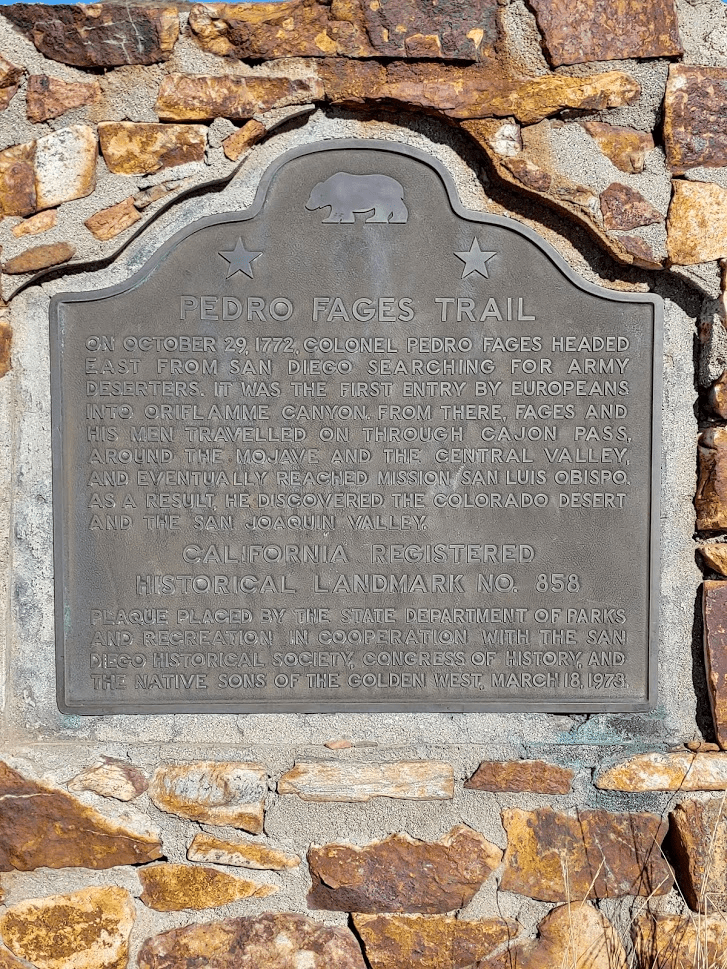 Chariot Mountain (4680 feet) is a modest summit in San Diego County in the transition zone between the Laguna Mountains to the west and the Anza-Borrego Desert to the east. It used to be on the San Diego 100 Peaks List but was removed for some reason many years ago. It lies just a few miles east of the Sunrise Highway, and there is a network of roads and trails in the area, so it is a relatively easy climb. I was planning to combine it with 2 other minor peaks in the area, Julian Ridge Benchmark (4885 feet) and Peak 5060, for a 9 mile loop hike. It would be a much shorter hike than what I’m used to, but I didn’t want to push it too hard since I recently had laser eye surgery a few weeks prior, plus I was trying to be home by 12:30 for the Wisconsin Badgers football game. Stella would be joining me today for the first time in a few months. We made the 1 hour 10 minute drive from San Diego and parked on the side of the Sunrise Highway at the Pedro Fages Monument. Pedro Fages was a Spanish soldier who traveled this way in the 1700s (crossing the mountains and desert in this area was a very difficult task in those days).