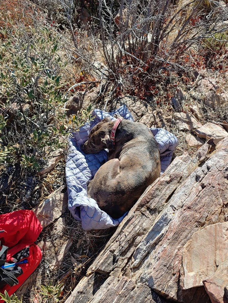 We reached the summit at 9:55am at 8.03 miles! I was surprised to find a register up here on such an obscure peak. There were just a few entries dating back to 2016. Stella was starting to look tired, so I was glad we were almost done.