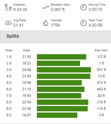 We spent some time soaking in the views before making our way down. We climbed down the slope of Peak 5060 and reached the trail again at 8.46 miles. From there it was a pretty quick hike back to the highway. We reached the car at 10:43am. This hike totaled 9.24 miles, 2087 feet elevation gain, and 4:20:06 total time.