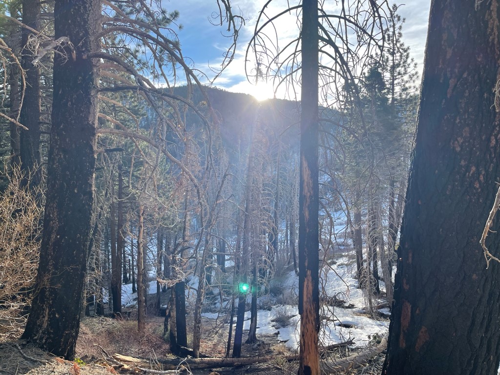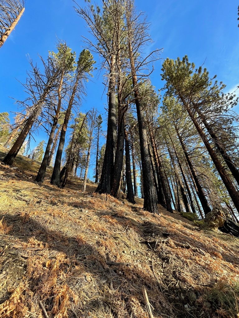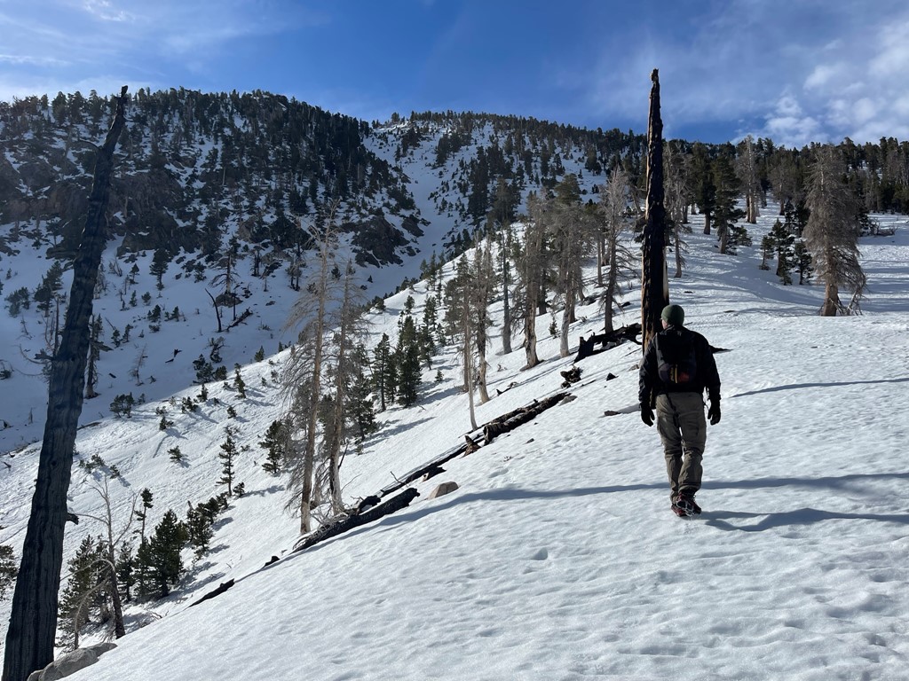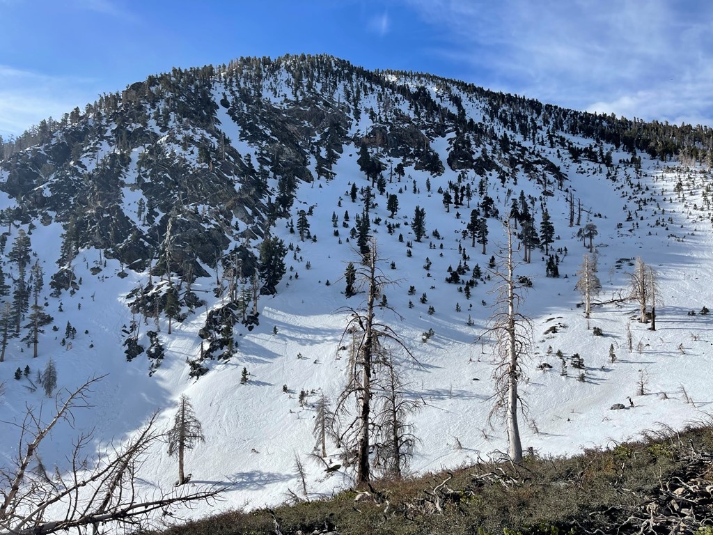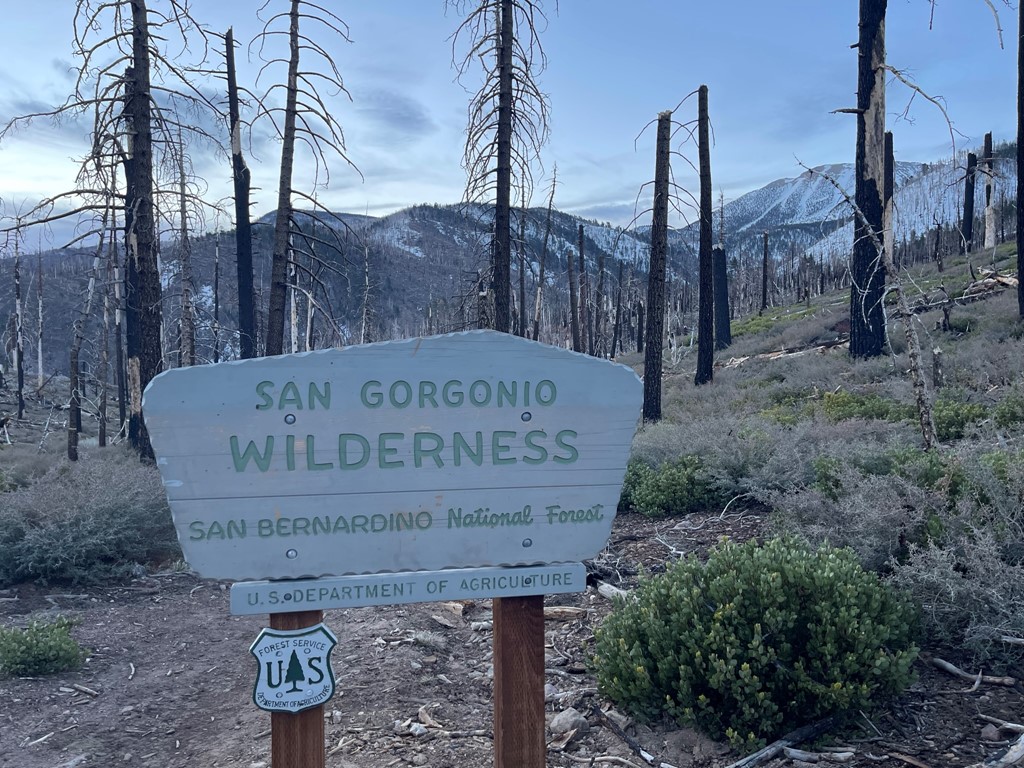 We proceeded southeast through the burnt pines. I had climbed San Gorgonio the week before from this same trailhead, so this part of the route was very familiar. At 3.7 miles we reached the Dry Lake/Dollar Lake split. Last week I had gone left to Dry Lake. Today we would be going to right towards Dollar Lake.
