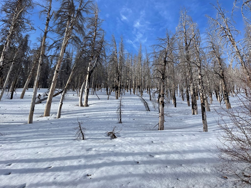 The trail was very hard to follow and there were many downed trees in the area. We decided to leave the trail and make a more direct line to the peaks. We climbed directly up the slope and then traversed around it to the left.