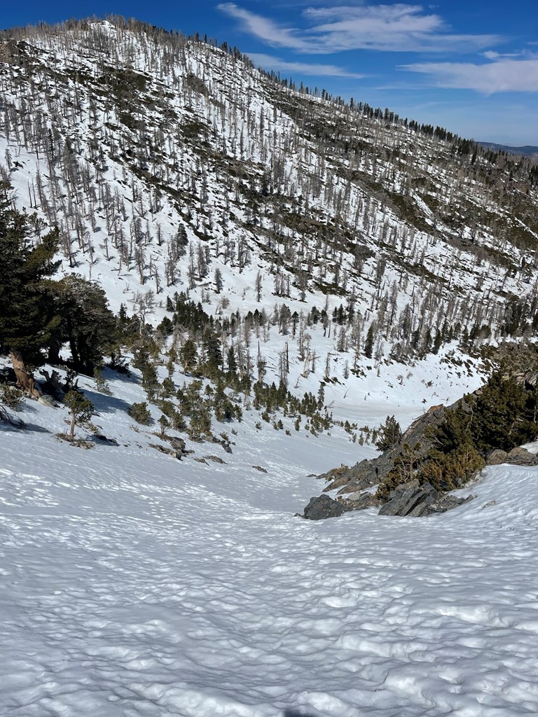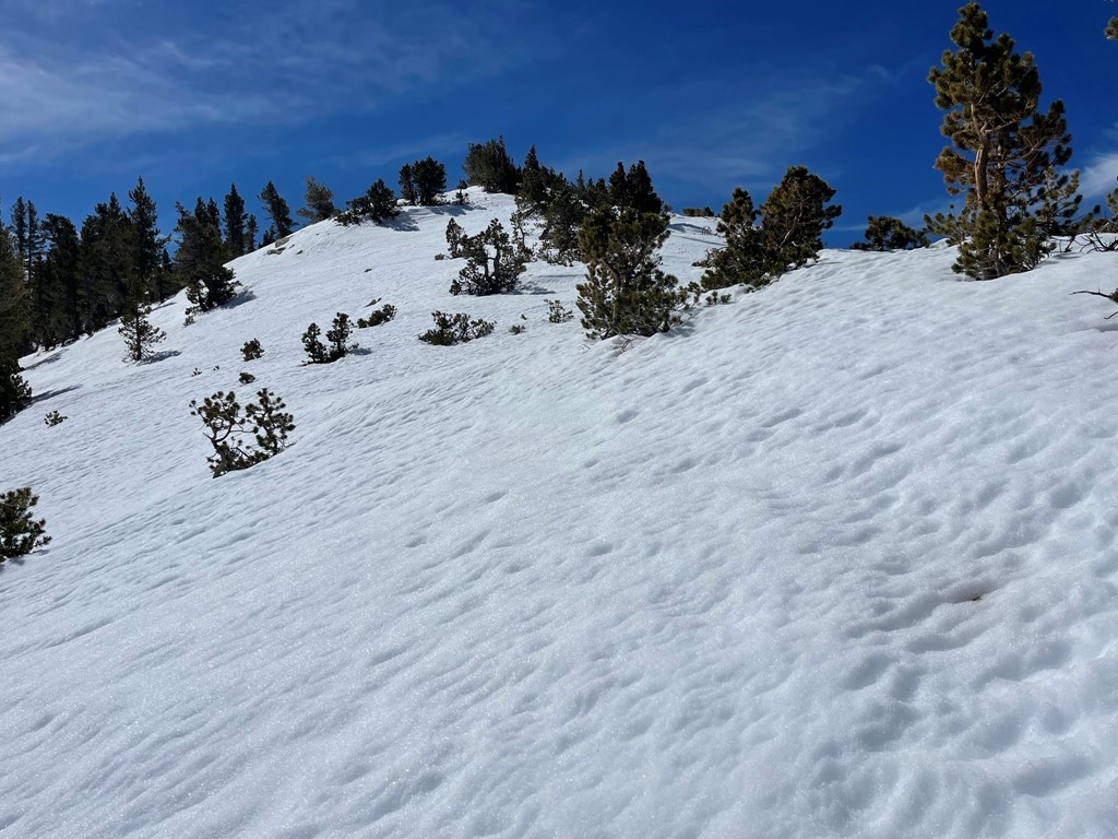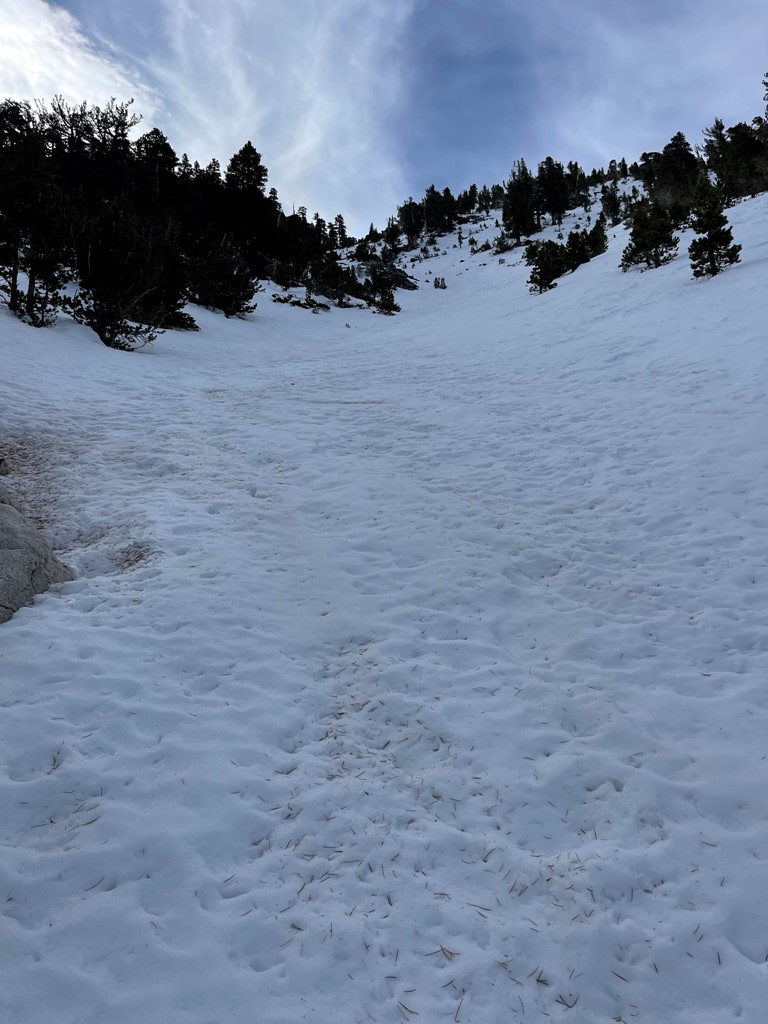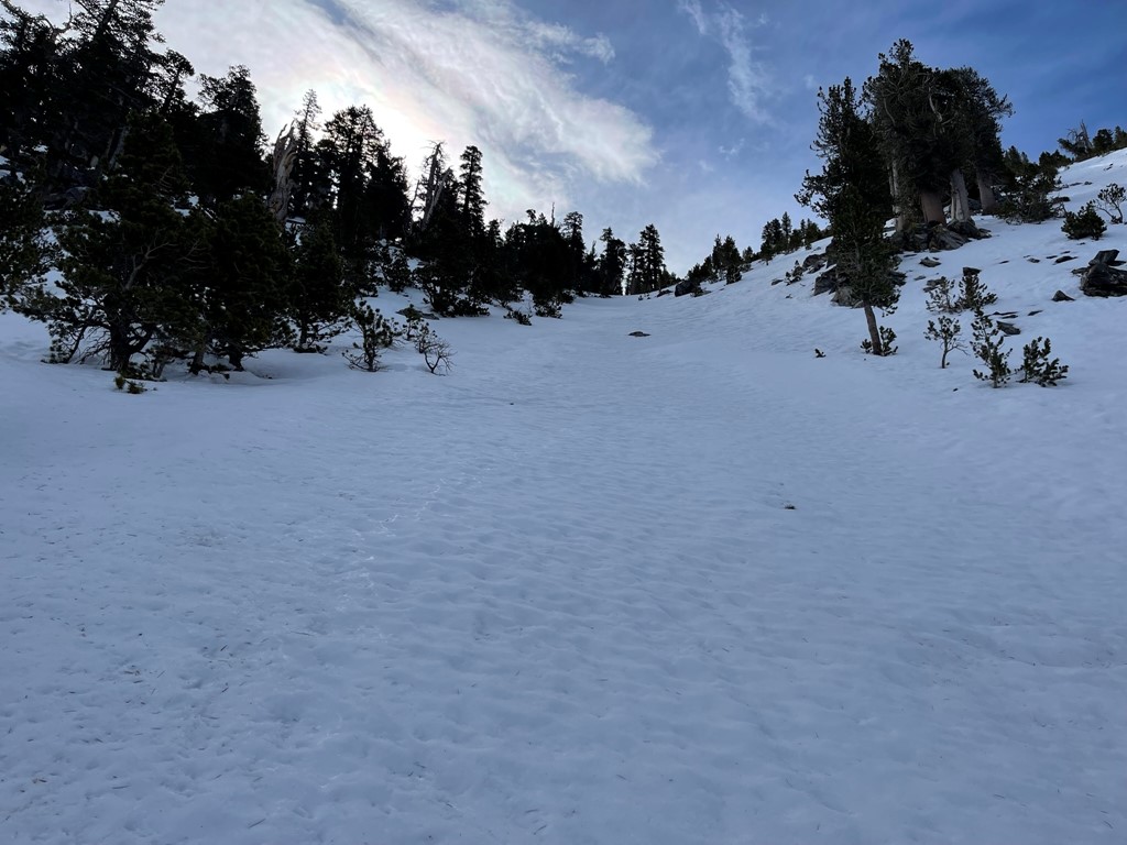 I hit a few soft spots around 10300 feet. I managed to get around it by traversing to the left and ascending a short section in the trees.