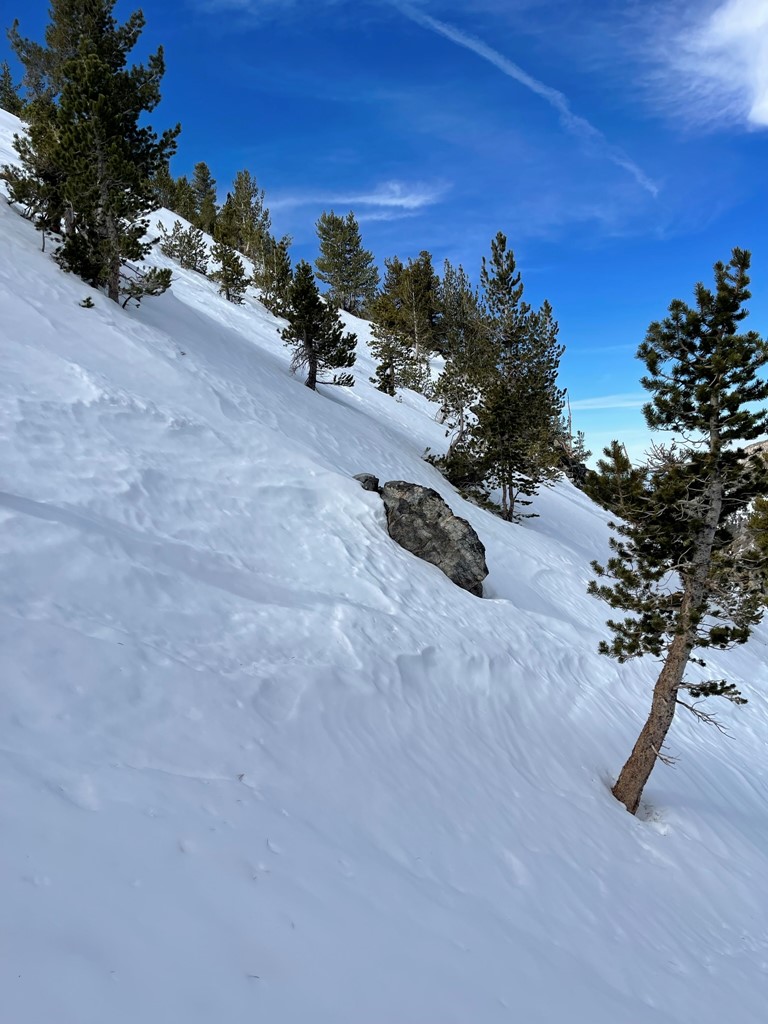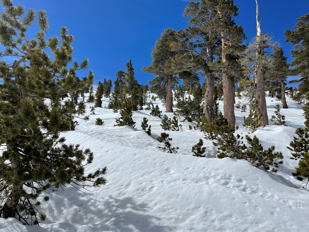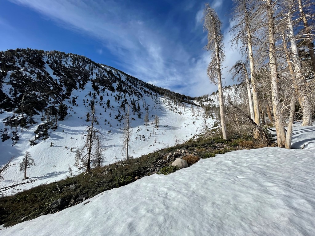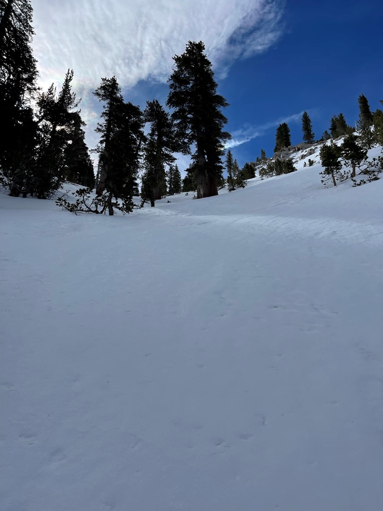 I hit a few soft spots around 10300 feet. I managed to get around it by traversing to the left and ascending a short section in the trees.