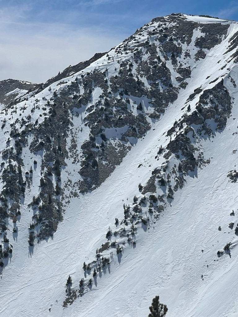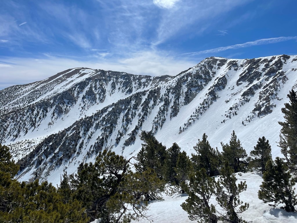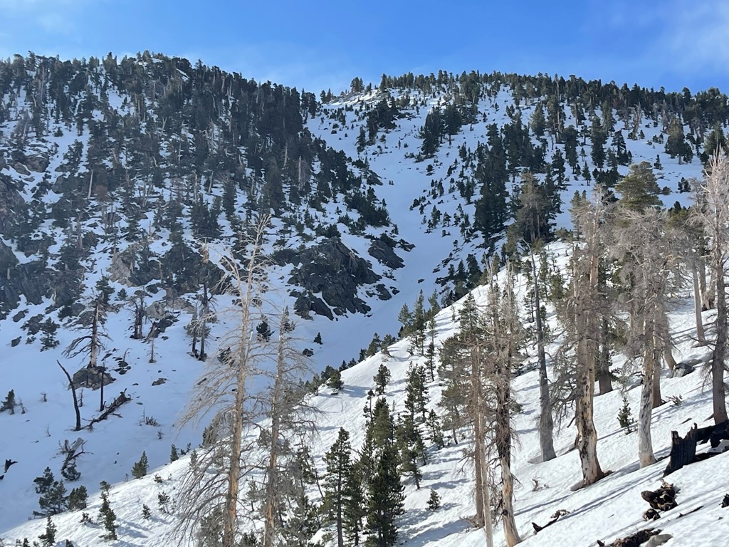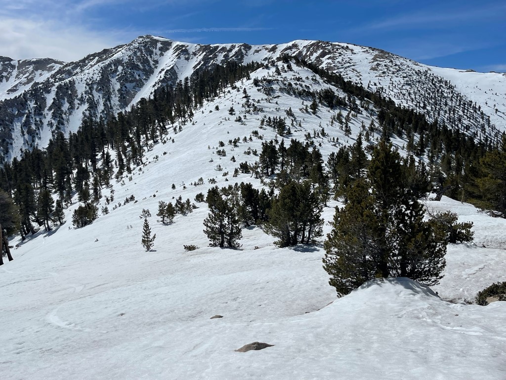 We got our first good look at Charlton Peak directly south of us. Dollar Couloir isn’t quite visible below. The mouth of the couloir is on the right side, and it ascends up and to the left behind the ridge in the center.
