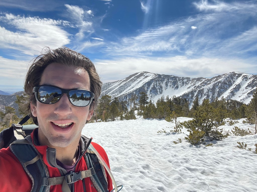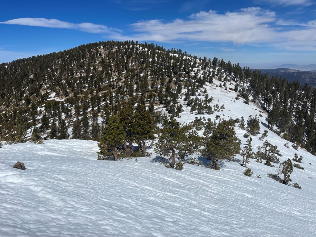 I reached the summit at 10:58am! Once again, I didn’t bother to dig through the snow for a register. I had an excellent view of San Gorgonio (left) and Jepson Peak (right).