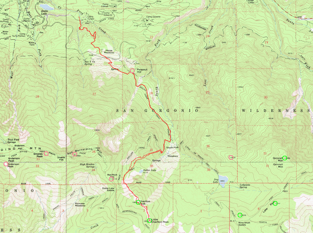 Charlton Peak (10806 ft) and Little Charlton Peak (10696 ft) are 2 peaks in the San Bernardino Mountains northwest of San Gorgonio. Charlton is on the HPS list and Little Charlton is a small bump less than a half mile to the southeast. My new friend Brian and I intended to climb both from the South Fork Trailhead. Our plan was to take the trail towards Dollar Lake, ascend Dollar Couloir to Charlton Peak, and then traverse the ridge to Little Charlton. I had slept at the trailhead the night before. We got up early and began hiking at 5:47am from 6876 feet above sea level.