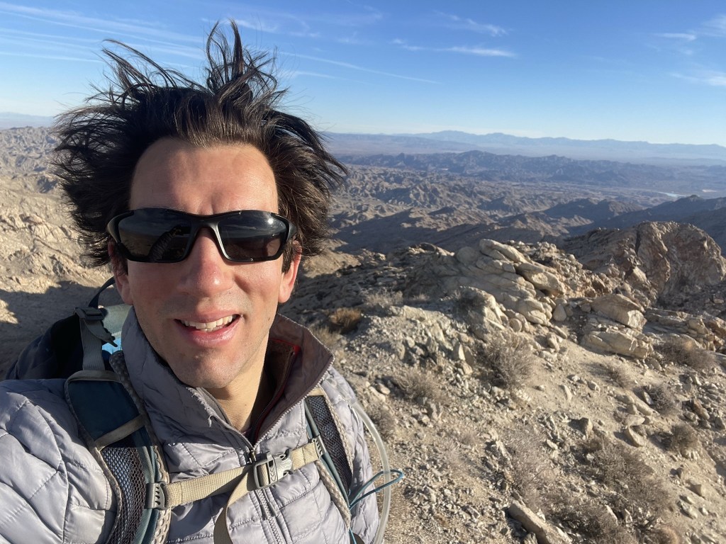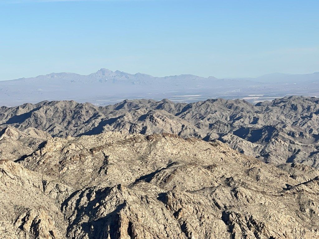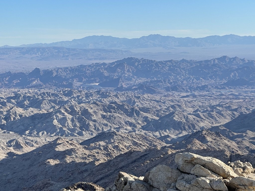 I reached the summit at 1:18pm at 4.6 miles! I signed the register which had been placed in 1999. The previous entry was from January 21. The views were similar to this morning but slightly worse due to being 700 feet lower. I had a great view of Chemehuevi Peak east across the valley. Crossman Peak in Arizona can be seen in the background.