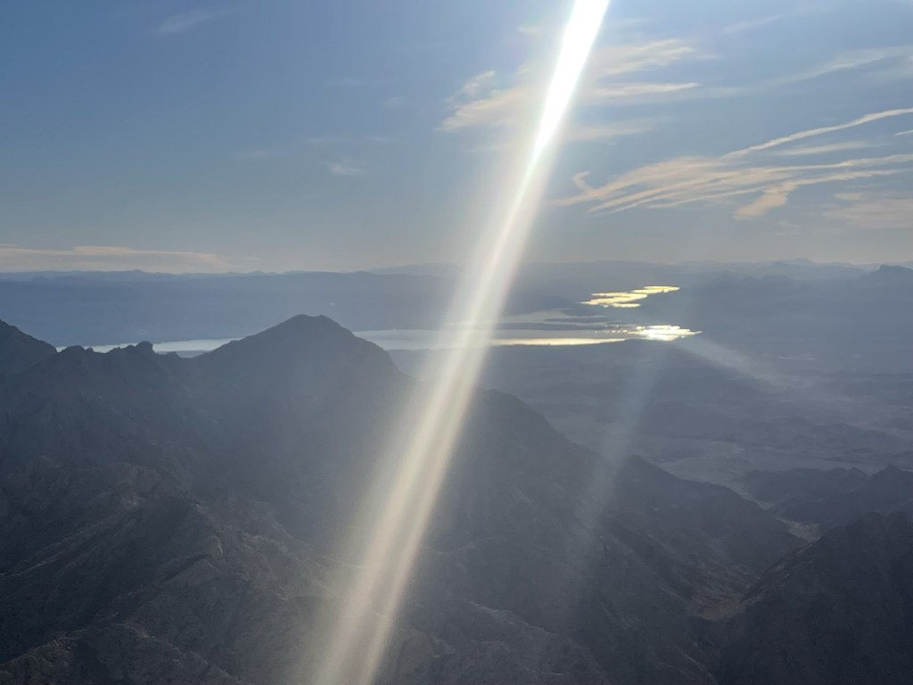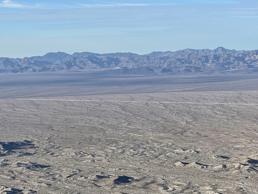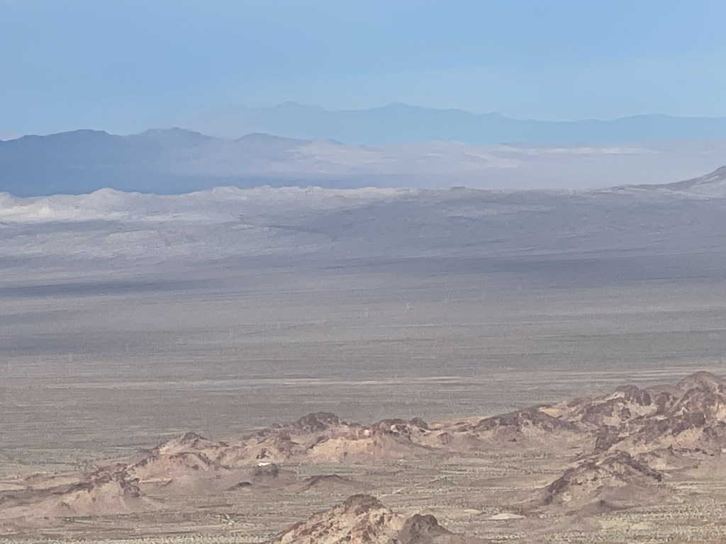 The views were pretty good despite some cloudiness. To the southwest I could see the Turtle Mountains. Mopah Point and Umpah Peak can be seen on the far left. US-95 can be seen in the center.