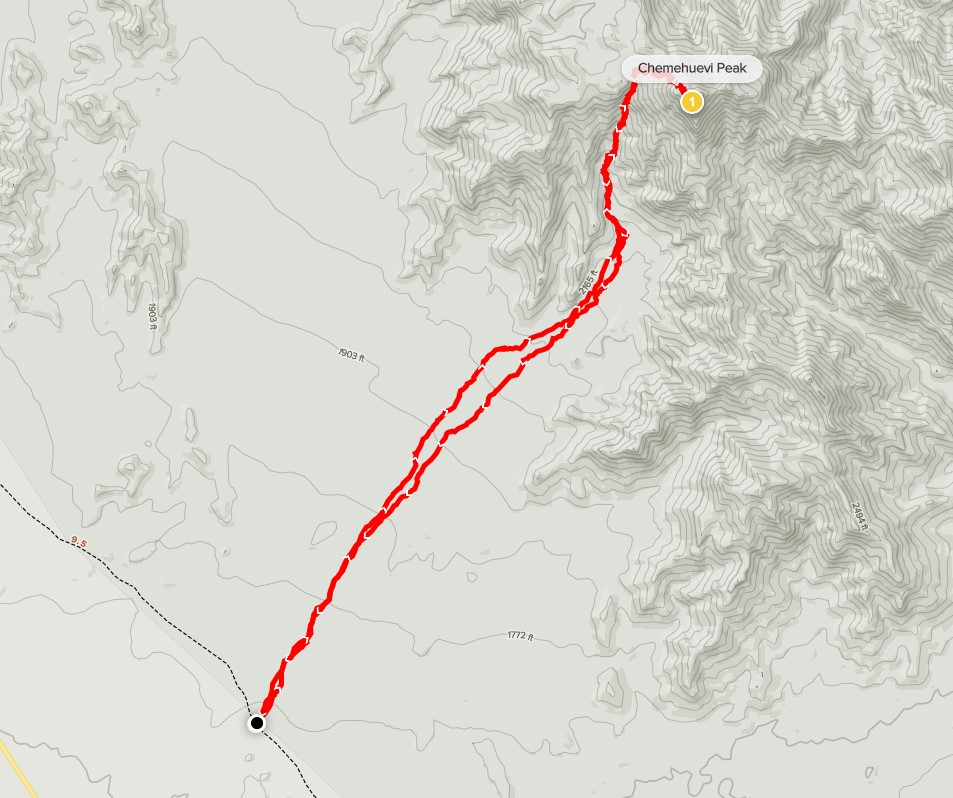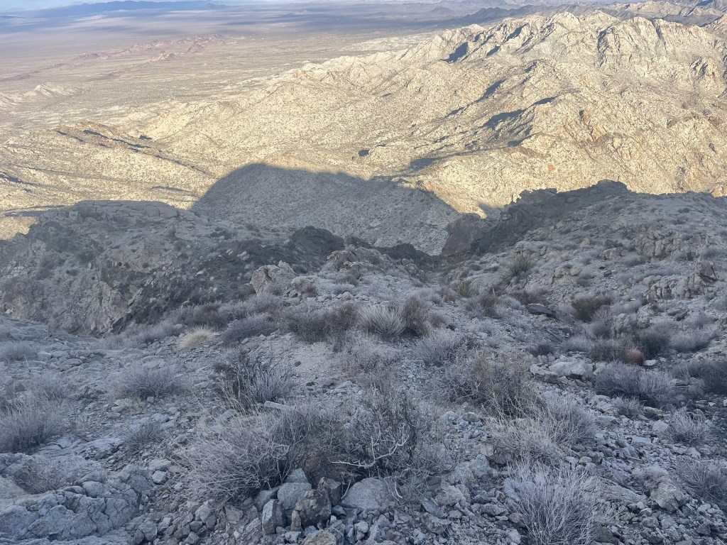 I descended directly east off the peak. I found a steep wash to climb down the last few hundred feet to the desert floor.