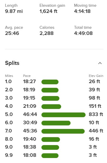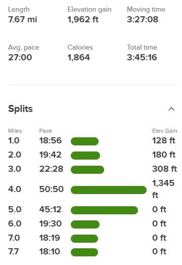 The rest of the descent was uneventful. I reached the car at 9:52am. Stats for this hike were 7.67 miles, 1962 feet elevation gain, and 3:45:16 total time.