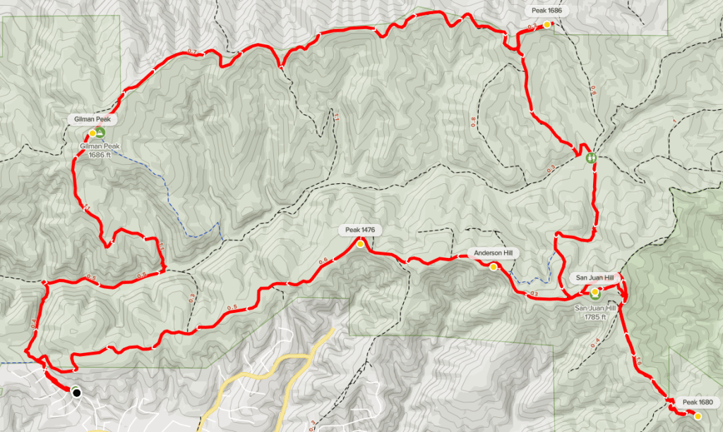 I had 2 more minor peaks to climb just off the South Ridge Trail. The first one was Anderson Hill (1560 feet) and the second was an unnamed peak (1476 feet). Both were closer to the trail than the previous peak so were easy to reach. I got a few odd looks from passing mountain bikers who probably wondered what I was doing fighting through the brush, but oh well. Both peaks had okay views, but nothing new compared to the previous peaks. After the peaks, I followed the South Ridge Trail back to the trailhead. I reached the car again right at noon. This hike totaled 12.79 miles, 2277 feet elevation gain, and 4:22:06 total time.