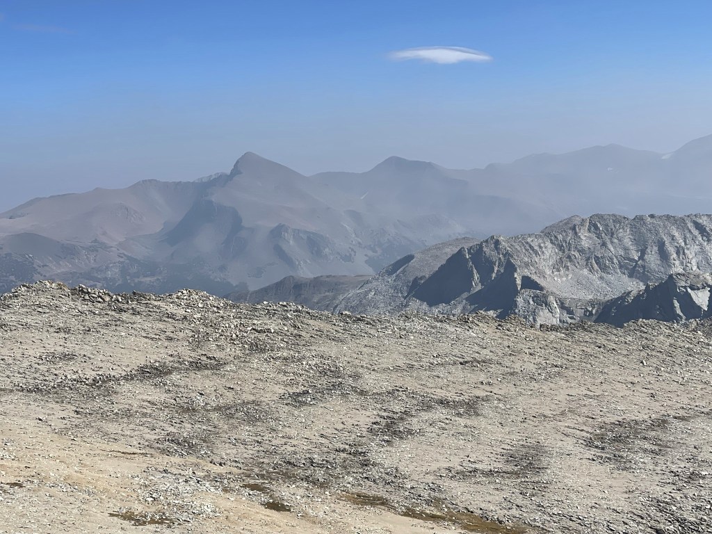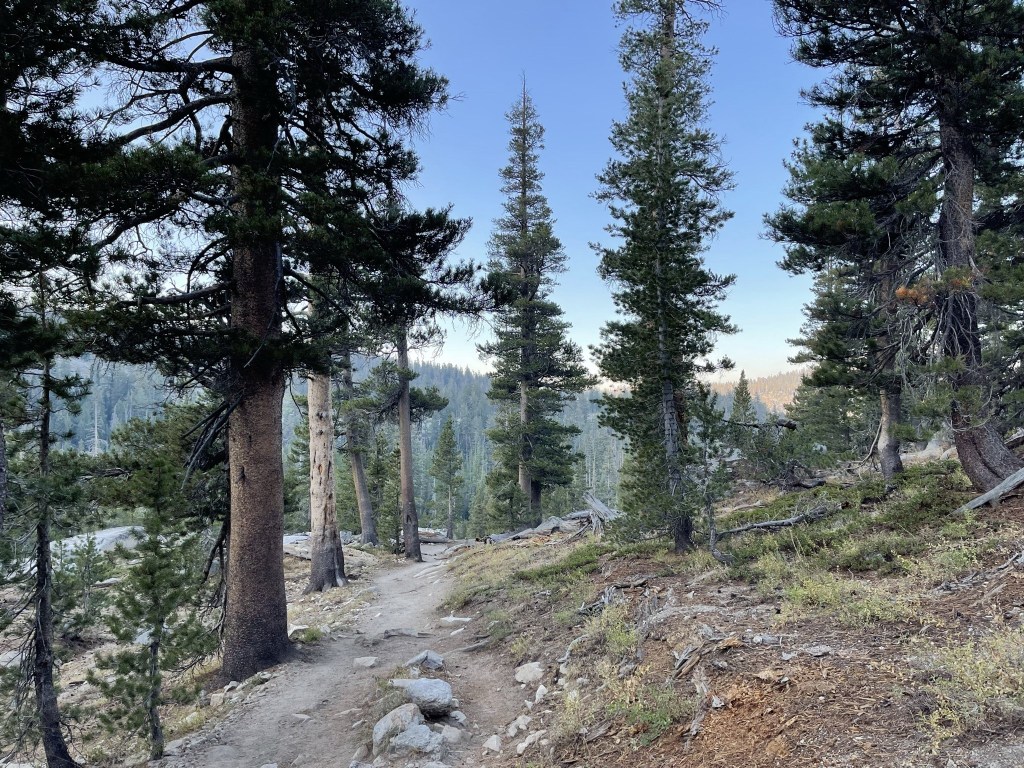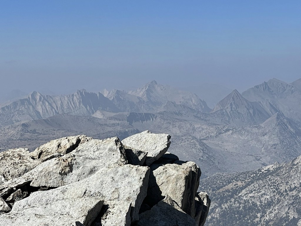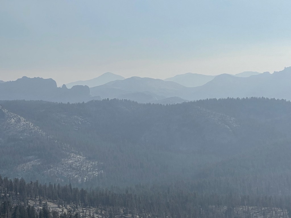 I could barely see Lyell and other peaks to the east through the smoke, but my pictures did not turn out well. I began descending after a 20 minute break.