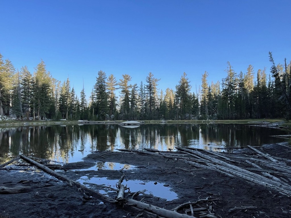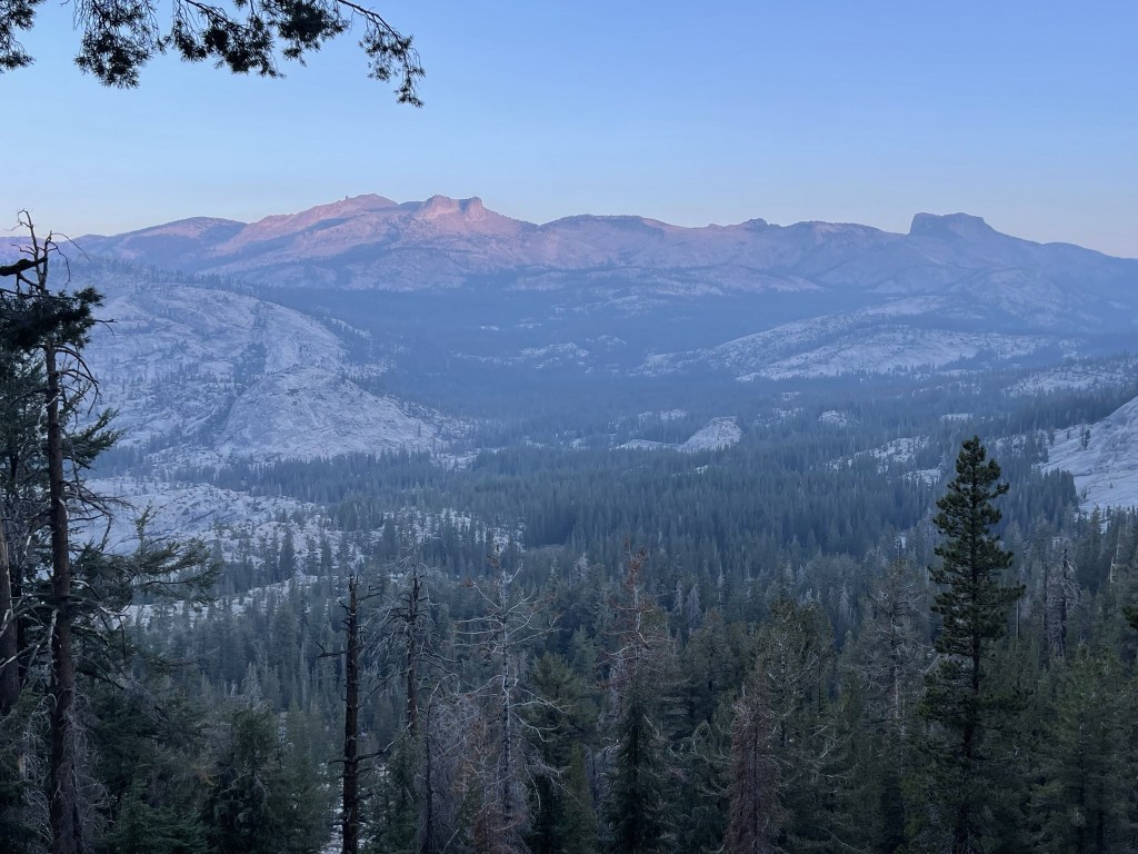 The morning glow from the sun began to hit the mountains behind me. Mount Hoffman and Toulumne Peak are pictured below.