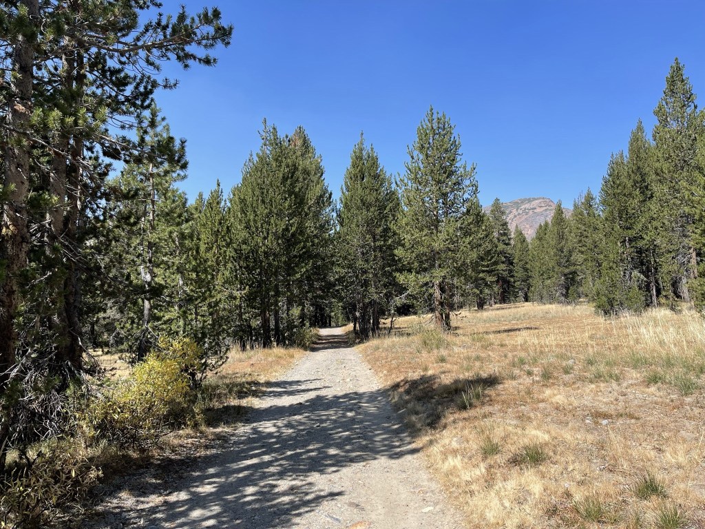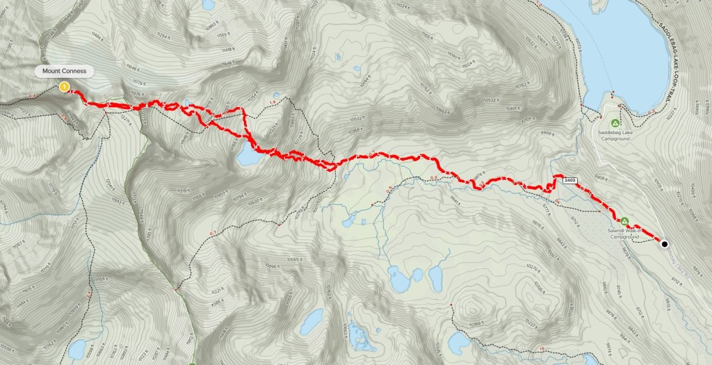 My plan for the afternoon was to climb Mount Conness, a 12590 foot peak not too far away. Conness, like Mount Dana, is on the eastern border of Yosemite. It has the cool distinction of being the highest peak in the Sierra north of Tioga Pass and Highway 120. There are multiple ways to approach Mount Conness, but I chose the shortest route which begins near Saddlebag Lake in Inyo National Forest. It took me about 45 minutes to make the drive to the trailhead, which begins at Sawmill Campground. The campground, which was closed for the season, has about 10-15 walk-in sites. The lot had a sign indicating that parking was for campers only, but that didn’t seem to apply since the campground was closed. I began this hike at 12:20pm from 9703 feet.