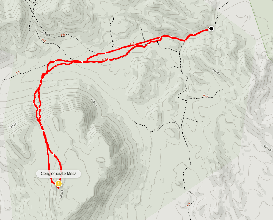 I took a different ridge on the descent, this one slightly north of the ascent route. I reached the car at 2:30pm. Stats for this hike were 1.85 miles, 568 feet elevation gain, and 1:24:50 total time.