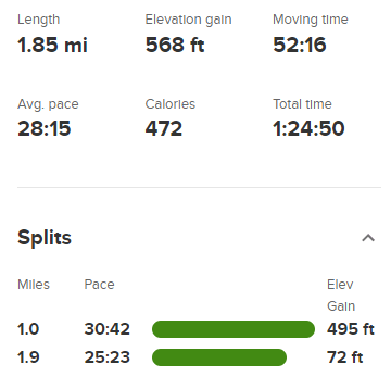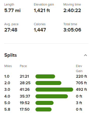 I reached the car at 8:54am. Stats for this hike were 5.77 miles, 1421 feet elevation gain, and 3:05:06 total time.