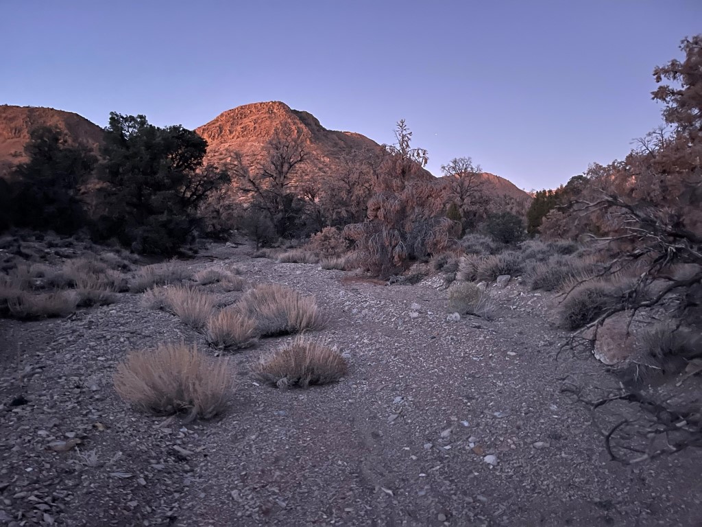 My plan for the final day of my 5 day road trip was to climb 3 more Zdon peaks in the southern end of the Inyo Mountains (and the surrounding desert). First up was 7724 foot Conglomerate Mesa. I had driven to the trailhead the night before after climbing nearby Malpais Mesa. From Highway 190, I followed Zdon’s directions by driving north on Saline Valley Road for 8 miles, then left on White Mountain Talc Road. Both of these roads are drivable for almost any car, but they are badly washboarded so be prepared for a bumpy ride. I drove a few miles on White Mountain Talc Road and then turned left onto a small spur road, drove about a mile, then parked. When I woke up the next morning it was 24 degrees, so I turned the car on for a few minutes to warm myself up before starting. I began this hike at 5:49am at 6266 feet above sea level.