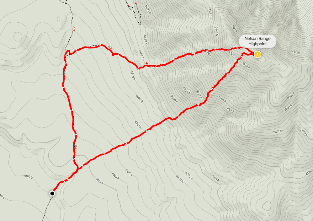 From there I followed a spur road west to the road I had driven in on, then hiked south back to the car. I reached the car at 12:22pm. Stats for this hike were 3.26 miles, 1726 feet elevation gain, and 2:42:20 total time.