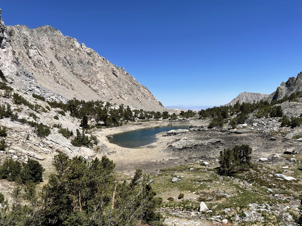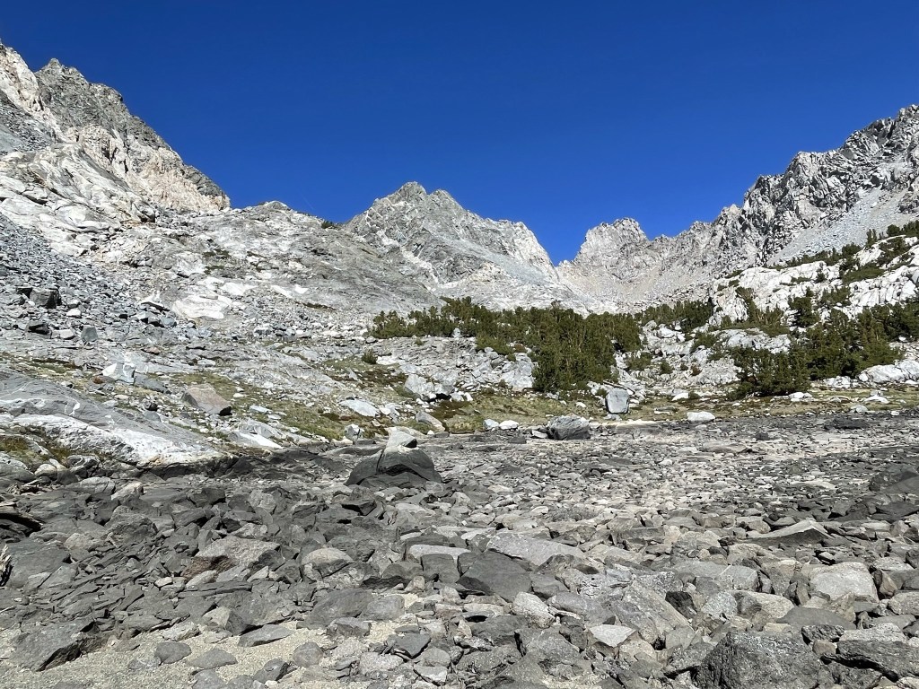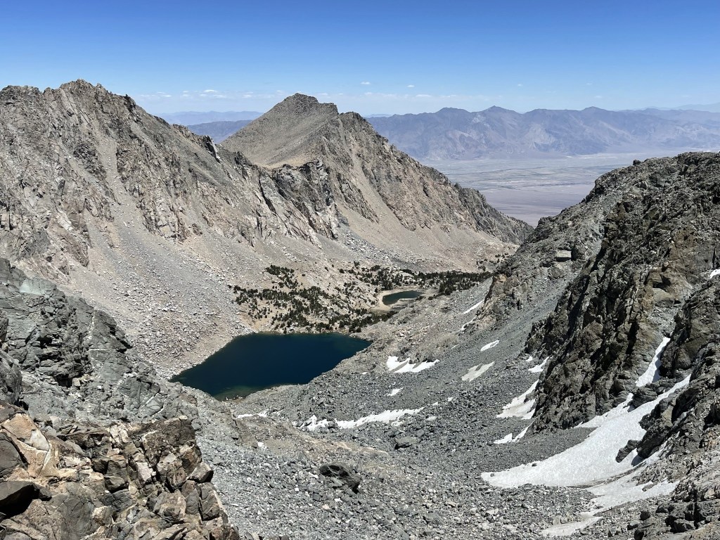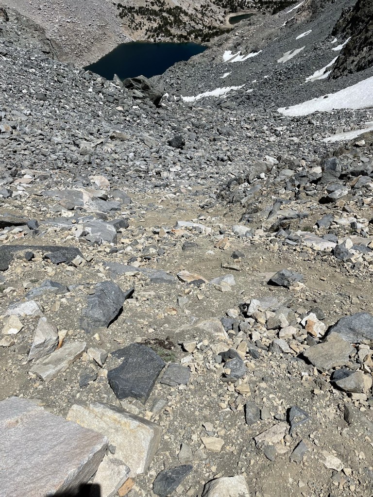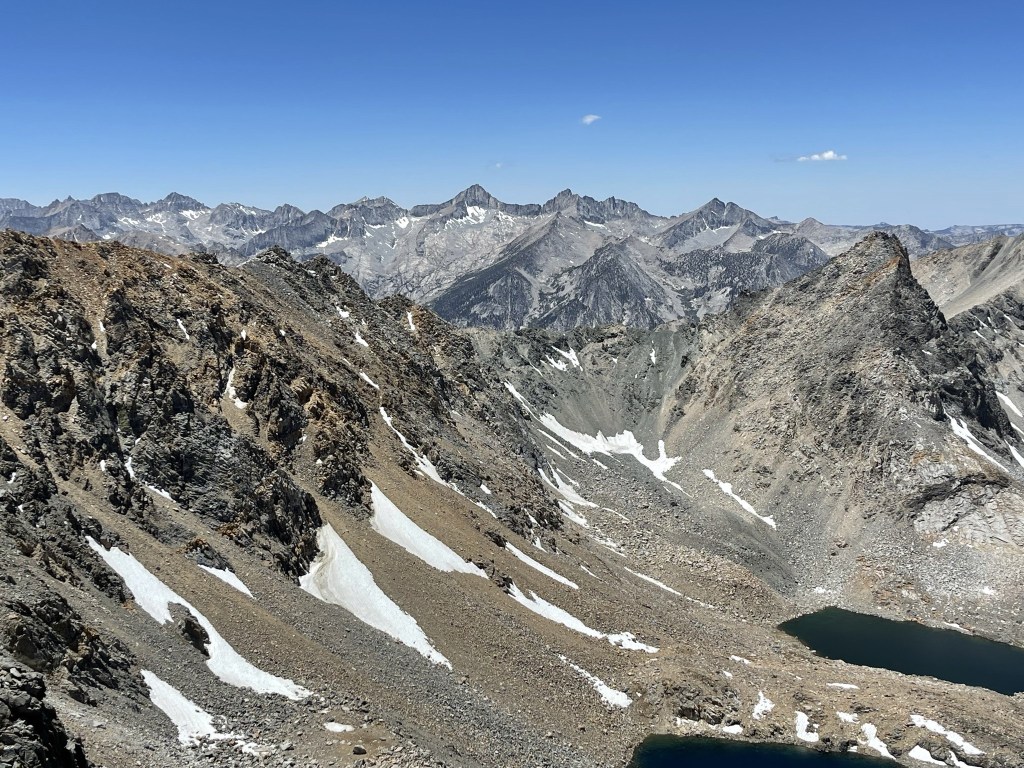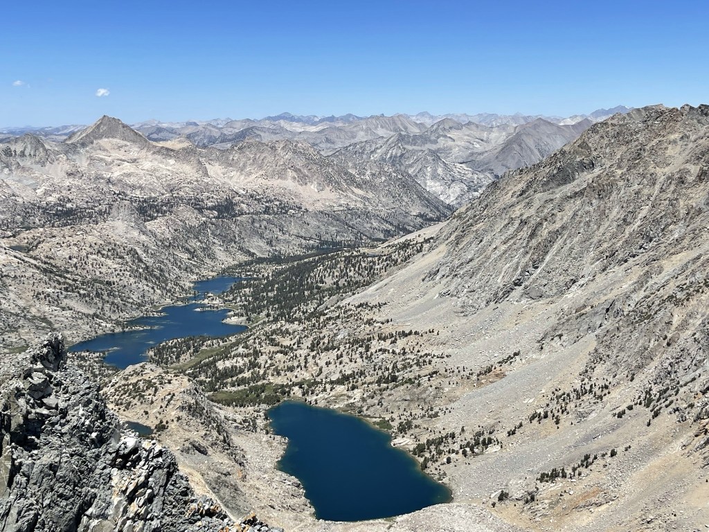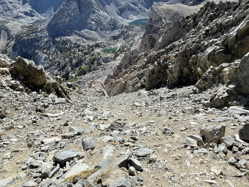 I climbed back down the chute towards the lakes. Kearsarge Peak, my next destination, is the peak in the center.