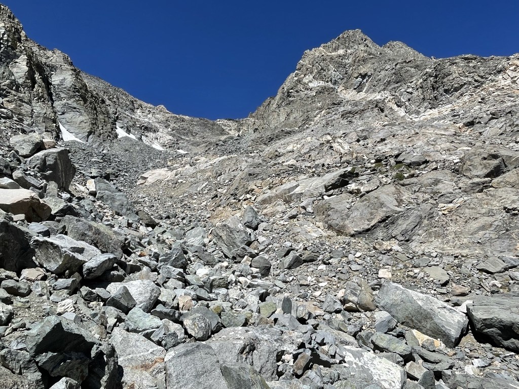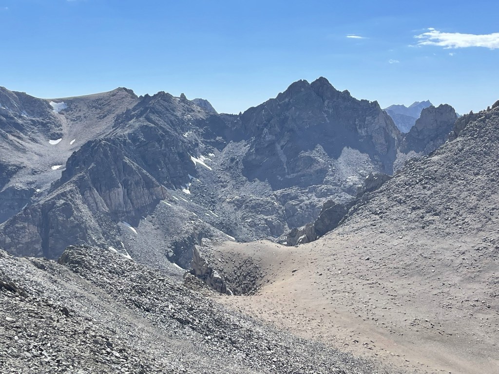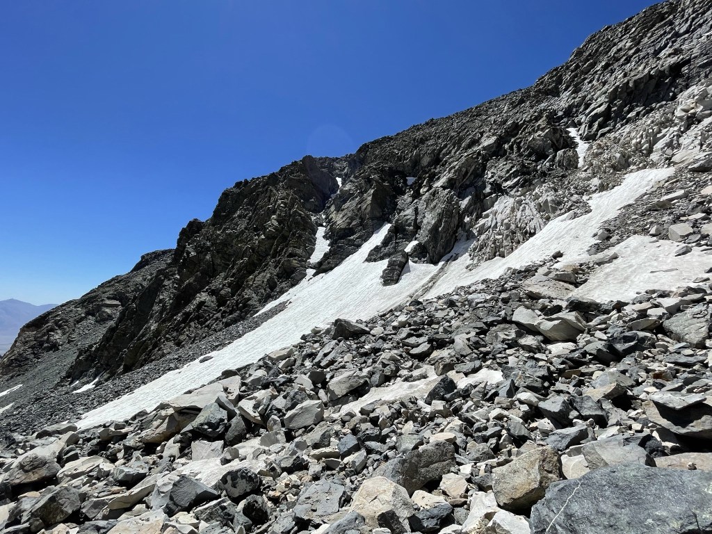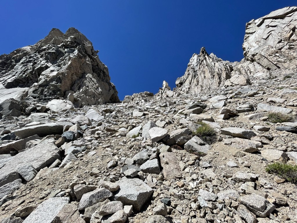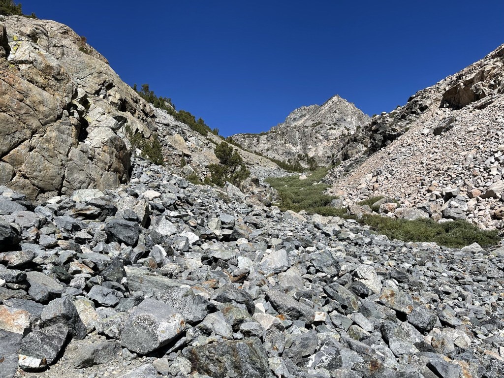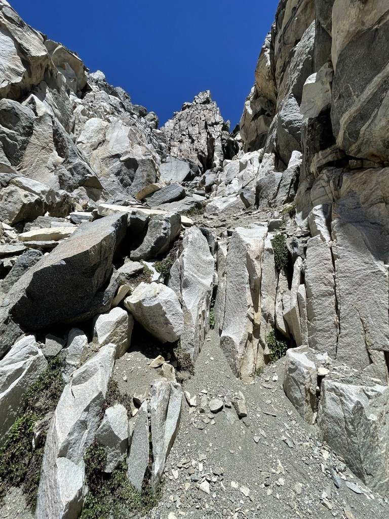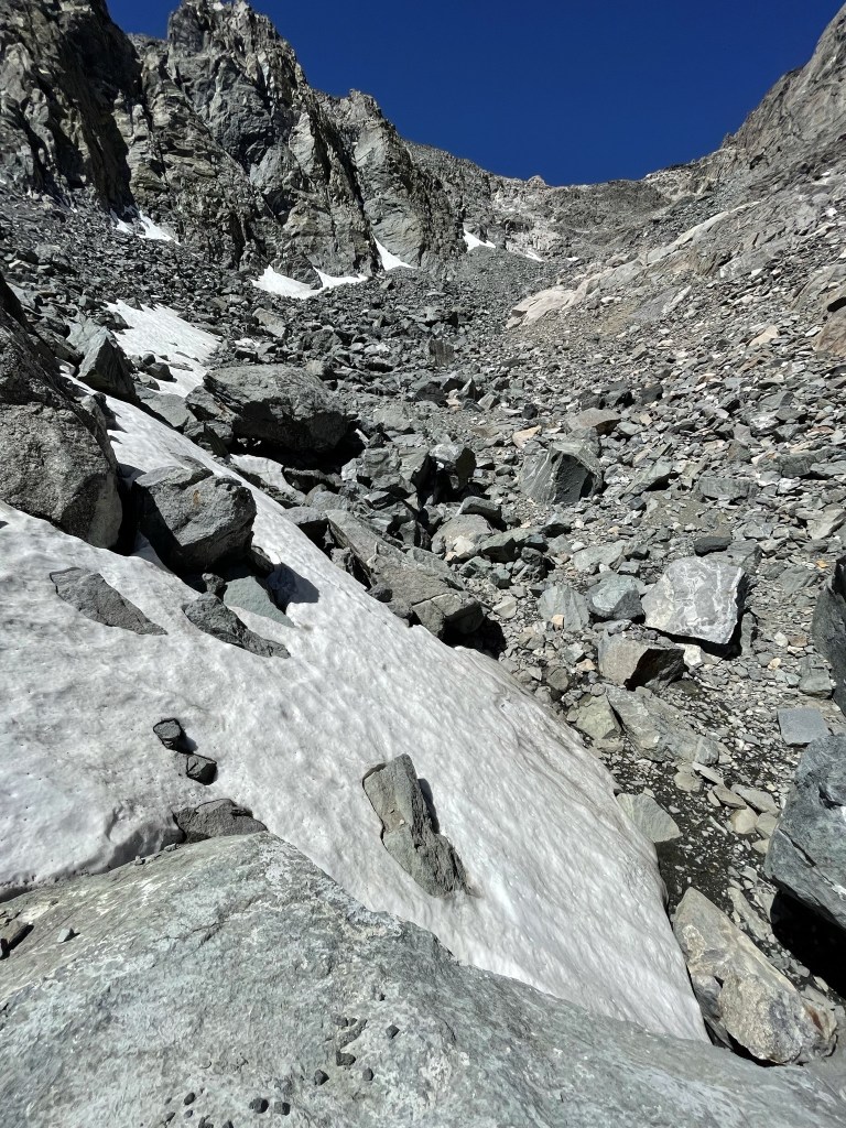 I began hiking up the chute towards the pass. There was some lingering snow in the chute, but it was avoidable.