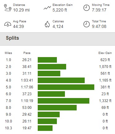 I reached the car once more at 6:32pm. This hike totaled 10.29 miles, 5220 feet elevation gain, and 9:47:08 total time.